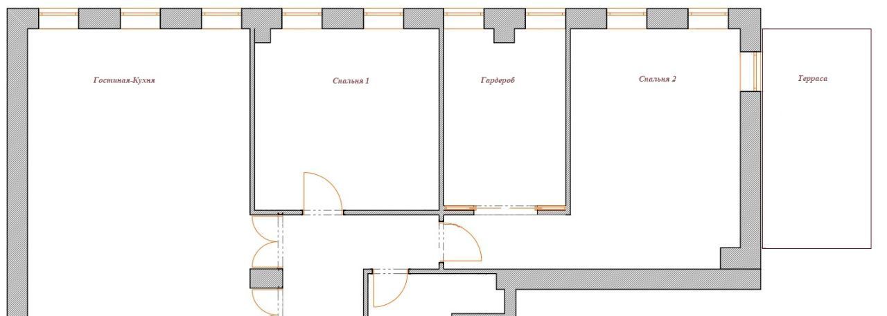 Холл - 15,0м2, гостиная - кухня - 47м2, две спальни -17,4м2 и -24,5м2. Гардеробная - 11,5м2, хоз.комната (постирочная) - 3,4м2, санузел - 6,7м2, терраса.