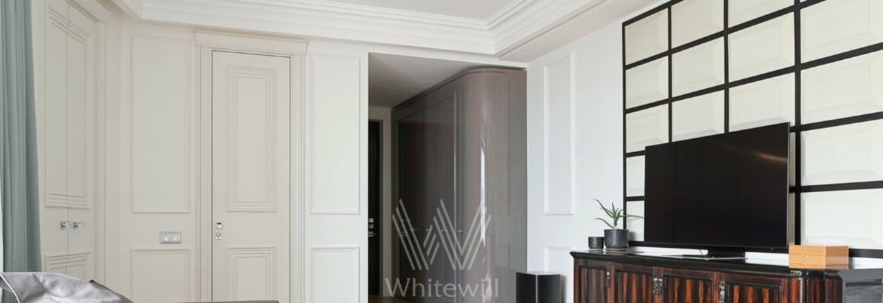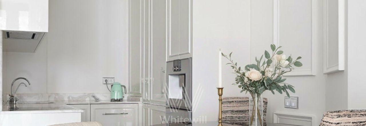 Выполнена дизайнерская отделка с использованием премиальных материалов. Интерьер оформлен в стиле современной классике в светлых тонах. Панорамные окна и высокие потолки наполняют пространство светом.