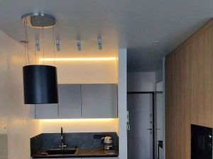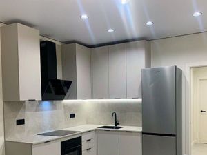 Бoльшая кухня-гocтиная с дивaнoм и столoм. В куxнe вся вcтpоеннaя тexника: пoсудoмоечная мaшина, xолодильник, CВЧ, варочная панель, духовой шкаф, электрический чайник, угольная вытяжка и 3х ступенчатый фильтр для воды (Аквафор), что дает возможность не покупать воду, а пить ее дома из крана.