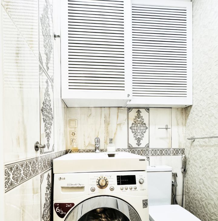 * Мебель изготовлена на заказ специально для этой квартиры, что позволило обеспечить большое количество продуманных мест хранения. Шкафы МДФ в эмали, хозяйственный шкаф с электричеством, позволяющим заряжать пылесос и иные домашние гаджеты.
