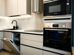 ID 45761. Стильная 3-комнатная квартира в доме deluxe класса на 27 квартир. Авторский ремонт в стиле современной классики. Интерьер оформлен в светлых тонах, стены декорированы молдингами, бытовая кухонная техника и премиальная сантехника Villeroy&Boch. Общая площадь: 69 кв. м. Планировка: уютная кухня-гостиная, 2 спальни с двуспальными кроватями, качественный санузел и холл. Дом отличается эксклюзивными фасадами с филигранной каменной резьбой, французскими окнами, эксплуатируемой кровлей, собственным садом и фитнес-клубом, дизайнерской отделкой всех общественных зон, подземным паркингом. Три корпуса высотой 4, 6 и 9 этажей образуют уютный внутренний двор с детской площадкой, местами для отдыха и небольшим садом.