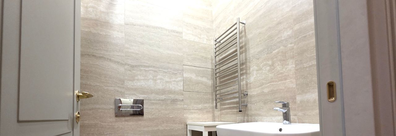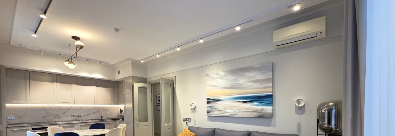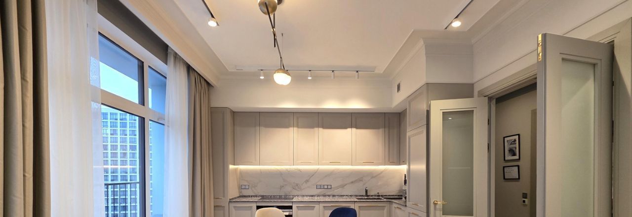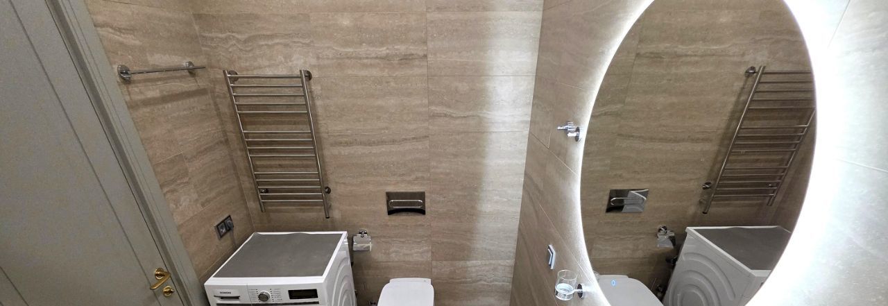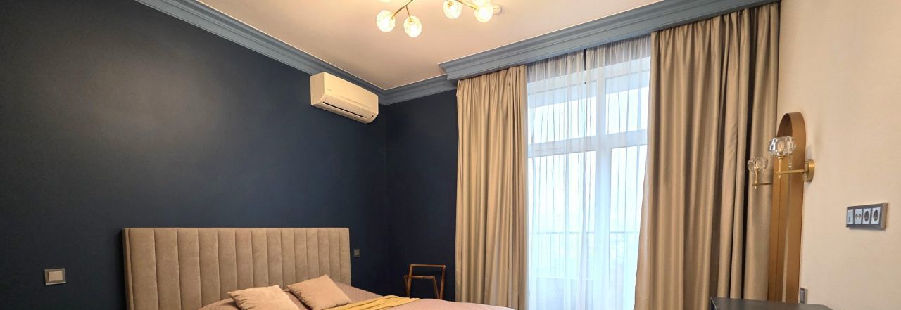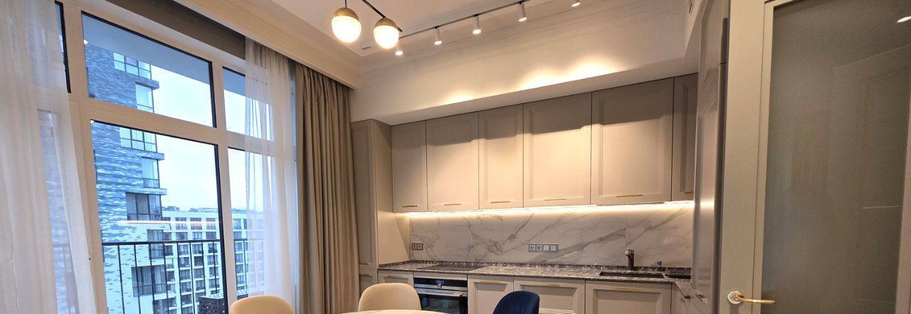 Красивая квартира - две спальни, уютная кухня-гостиная, два санузла и вместительная гардеробная комната. Полностью оборудована всей необходимой мебелью и техникой. Хорошая эргономика, достаточно мест хранения!