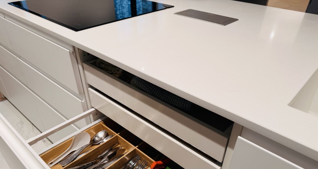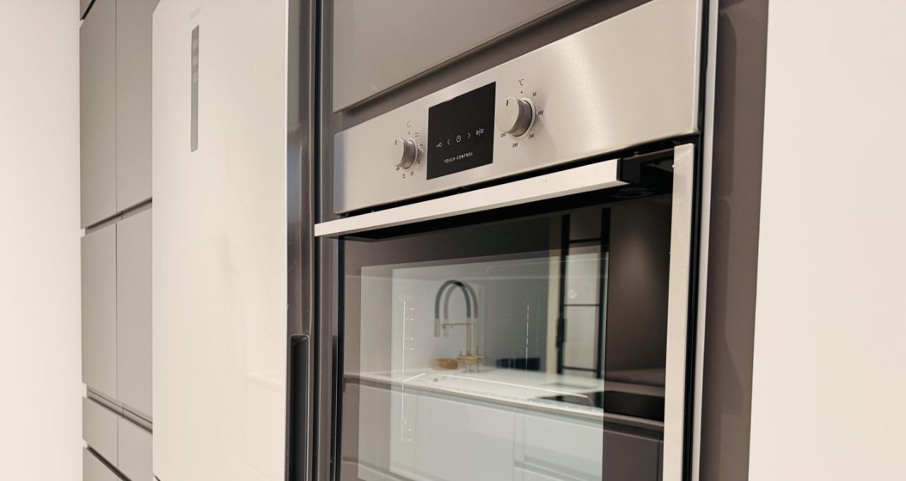 Кухня-гостиная со встроенной кухней, мебелью и техникой, есть посуда, телевизор.