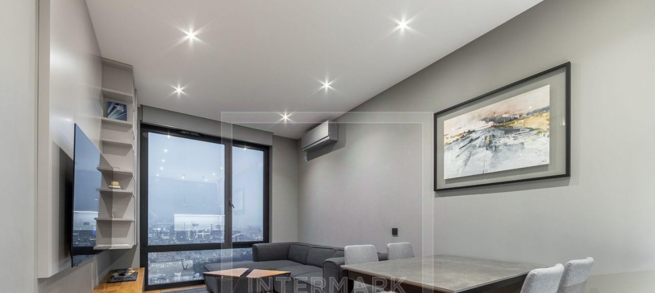 ID 44591. Видовая 3-комнатная квартира с панорамными окнами и машиноместом в ЖК "Пресня Сити" на высоком этаже. Общая площадь — 88 кв.м., высота потолков — 3 метра. Квартира с дизайнерским ремонтом в современном стиле: интерьер выдержан в монохромной гамме с элементами натурального дерева, использованы качественные отделочные материалы. Укомплектована мебелью и бытовой техникой, включая посудомоечную, стиральную и сушильную машины, два холодильника, винный шкаф, кондиционеры, систему тёплых полов, интернет и ТВ. Установлены автоматические ролл-шторы, USB-розетки, мастер-свич освещения у входа, а также независимая система вентиляции. Планировка включает просторную кухню-гостиную, основную спальню с гардеробной и видом на центр, детскую, которая при необходимости может быть переоборудована под вторую спальню или кабинет, а также лаунж-зону для отдыха с панорамным видом на Москва-Сити. Две ванные комнаты — с ванной и душевой кабиной. ЖК "Пресня Сити" — современный комплекс из трёх небоскрёбов с круглосуточной охраной, консьержем и видеонаблюдением. В стоимость аренды входит одно машиноместо в подземном паркинге. Дом расположен в тихом и благоустроенном Пресненском районе, в пешей доступности — станции метро "Улица 1905 года" (13 минут), "Белорусская" (1719 минут), удобный выезд на ТТК. Рядом — супермаркеты, школы, детские сады, кафе и рестораны. Можно с детьми. По данному объекту предусмотрено гарантированное вознаграждение профессиональным агентствам и частным брокерам.