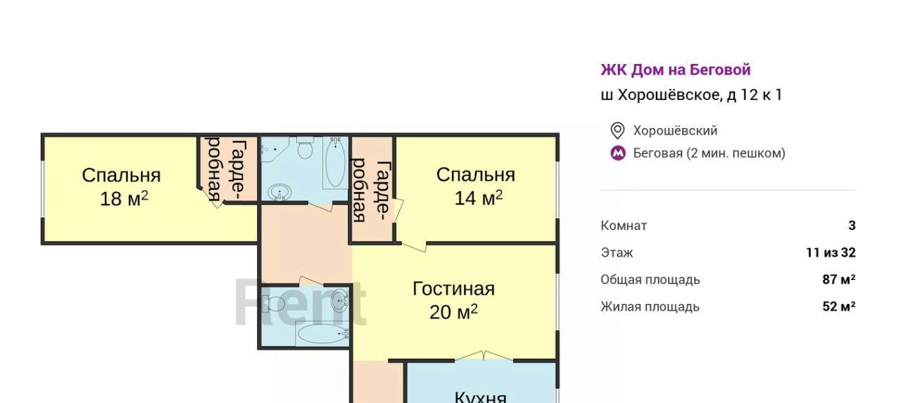Рядом работает ТЦ "На Беговой", магазины, кафе и рестораны, аптеки, медклиники, а в 25 минутах ходьбы раскинулся парк Ходынское Поле. Удобный выезд на ТТК и близость метро "Беговая" обеспечивают транспортную доступность.