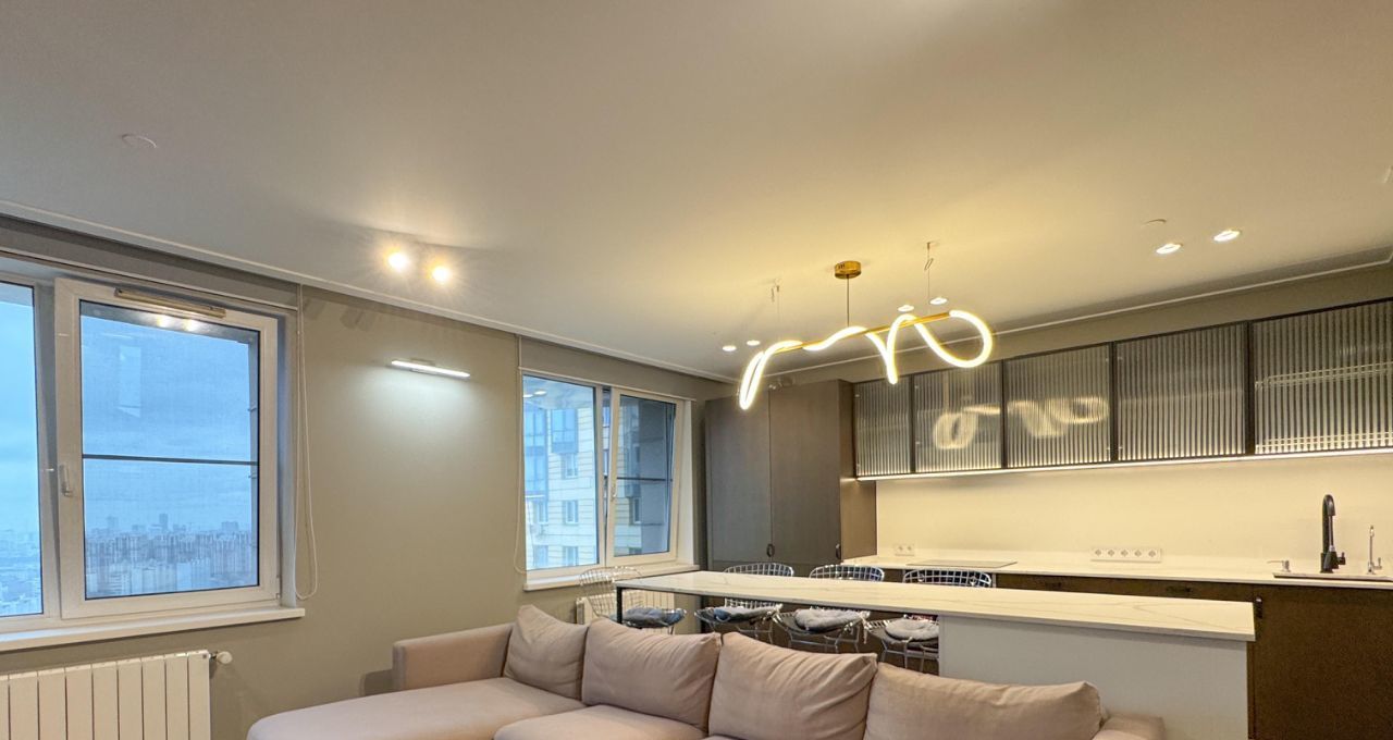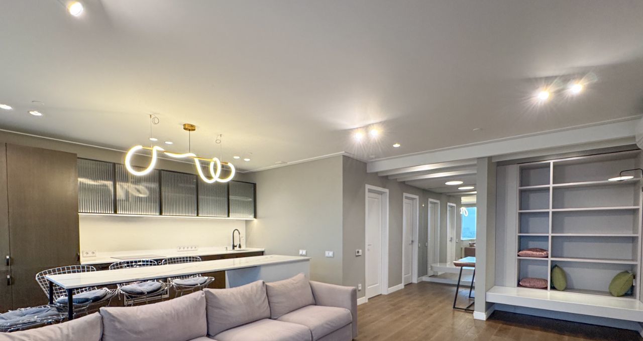 Сдается просторная трехкомнатная квартира 85 м² с дизайнерским ремонтом в ЖК Дом на Беговой. Планировка включает светлую кухню-гостиную около 20 м², отдельную спальню с мастер-ванной комнатой, второй санузел, полноценный кабинет и гардеробную/кладовую. Интерьер выполнен в современном стиле: продуманная система освещения, встроенные шкафы с внутренней подсветкой, большое зеркало во всю стену в прихожей, качественные отделочные материалы.
