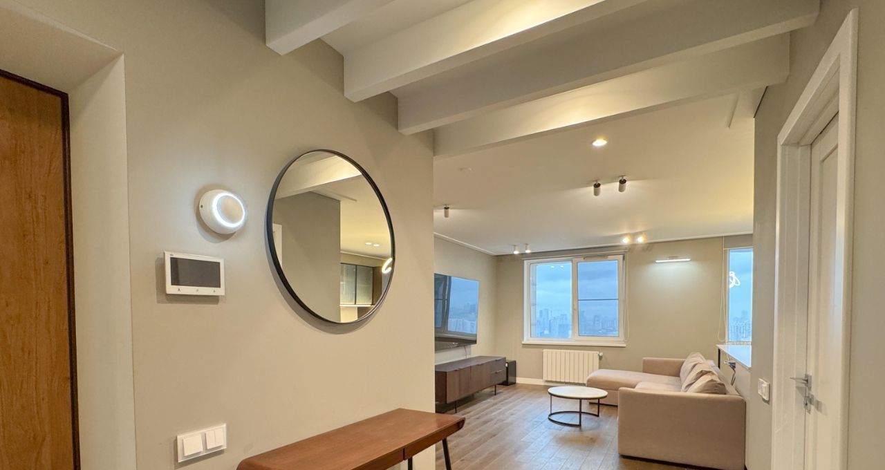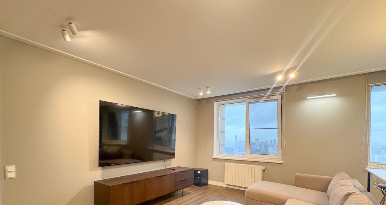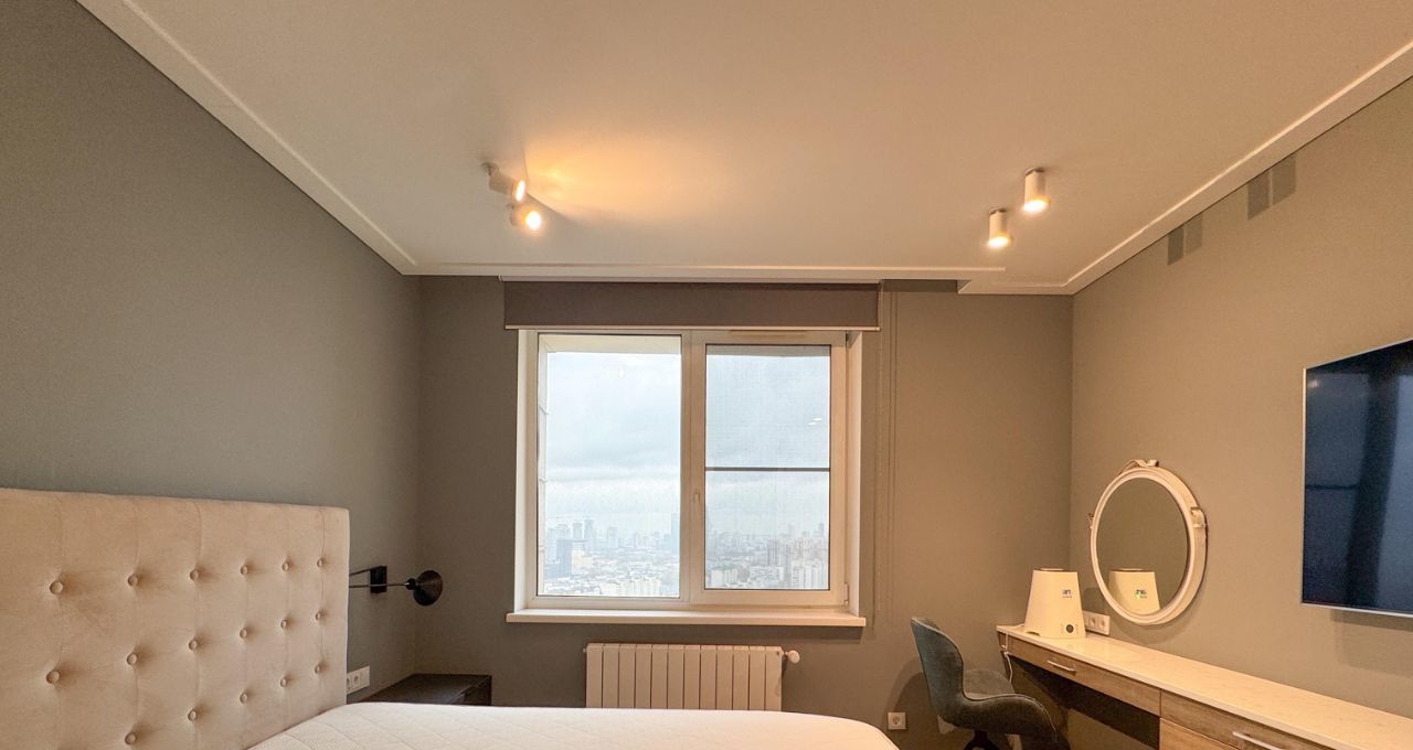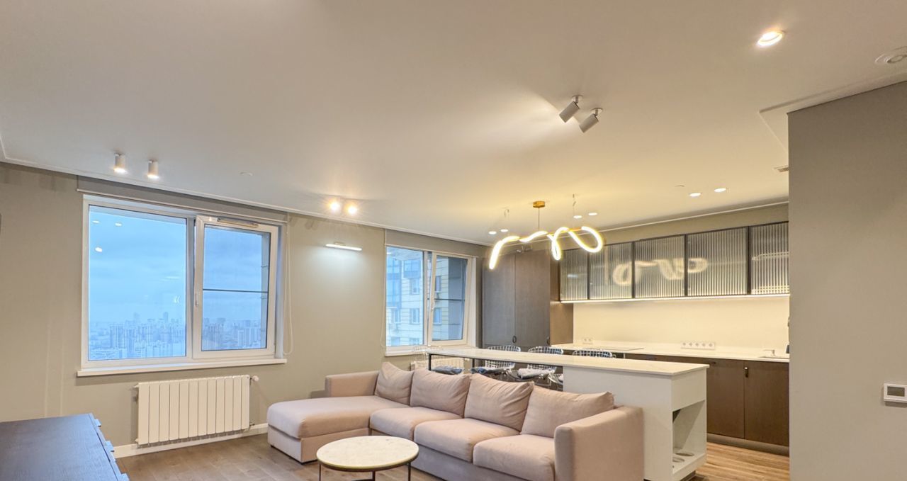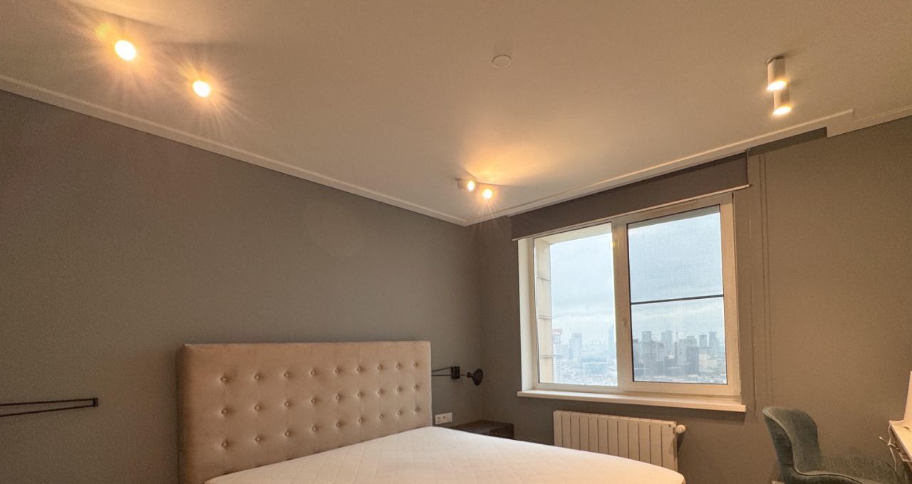 Квартира полностью оборудована для комфортного проживания: установлен комплект бытовой техники, посудомоечная и стиральная машины, сплитсистема кондиционирования, быстрый интернет, в гостиной — телевизор 80 дюймов, в спальне — 55 дюймов. Остается вся необходимая мебель, включая удобный матрас Askona и функциональный рабочий кабинет — формат заехал и живешь. Высокий этаж (31 из 43) обеспечивает панорамные виды на город и тишину, несмотря на центральное расположение дома.