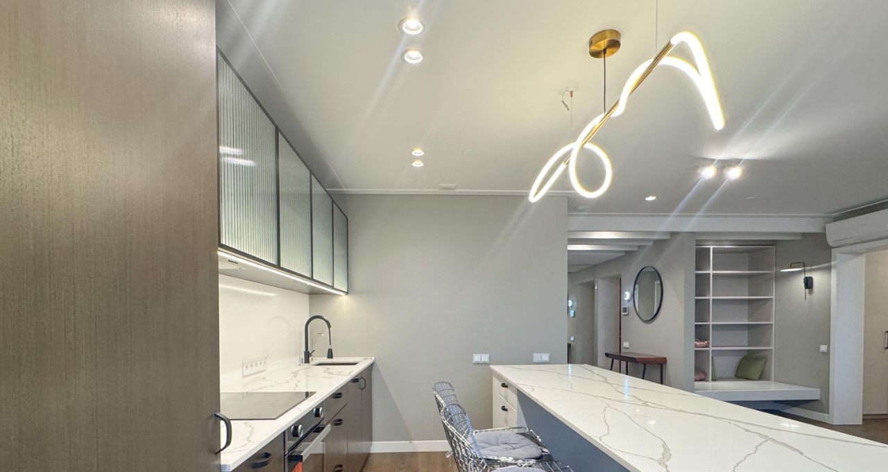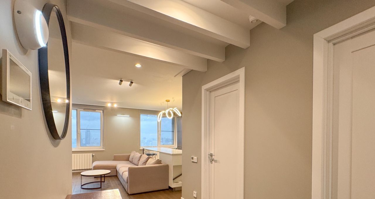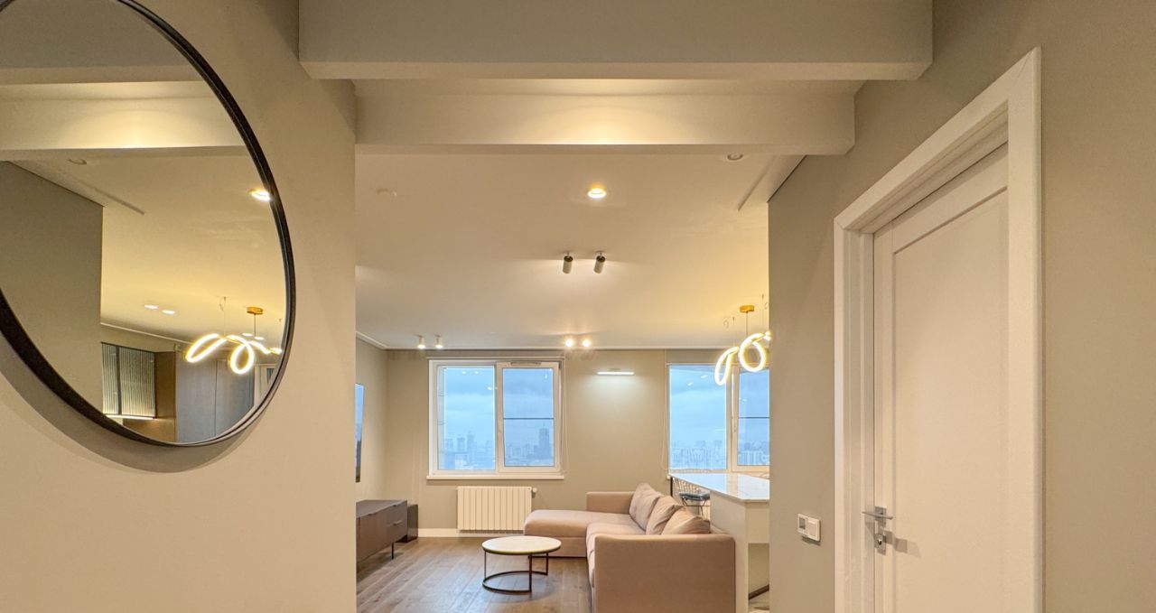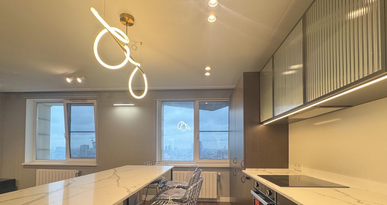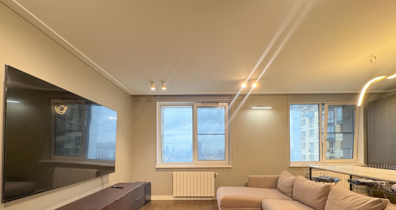 Квартира полностью оборудована для комфортного проживания: установлен комплект бытовой техники, посудомоечная и стиральная машины, сплитсистема кондиционирования, быстрый интернет, в гостиной — телевизор 80 дюймов, в спальне — 55 дюймов. Остается вся необходимая мебель, включая удобный матрас Askona и функциональный рабочий кабинет — формат заехал и живешь. Высокий этаж (31 из 43) обеспечивает панорамные виды на город и тишину, несмотря на центральное расположение дома.