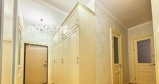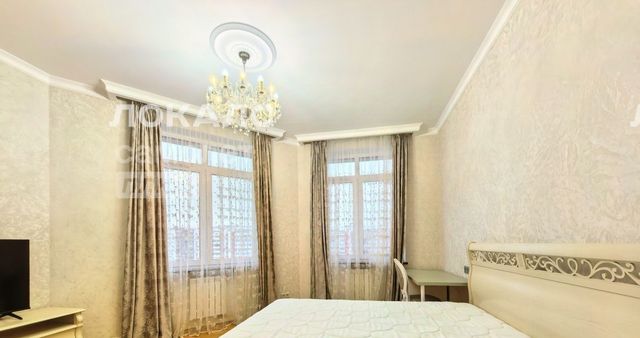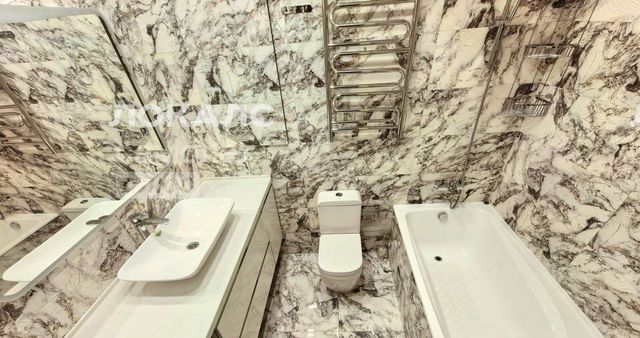 В квартире выполнен качественный ЕВРО-ремонт с использованием дорогих экологически чистых материалов, на полу паркет. Кухня укомплектована современным кухонным гарнитуром из массива дуба, также обеденная зона, посудомоечная машина, духовой шкаф, варочная панель, кондиционер, 2-е изолированные спальни укомплектованные спальным гарнитуром, на кроватях ортопедические матрасы. В санузлах полы с подогревом, также установлен проточный водонагреватель, стиральная машина, вся сантехника "Grohe" и "Jacob Delafon". В коридоре установлены вместительные шкафы. Шикарные холлы.