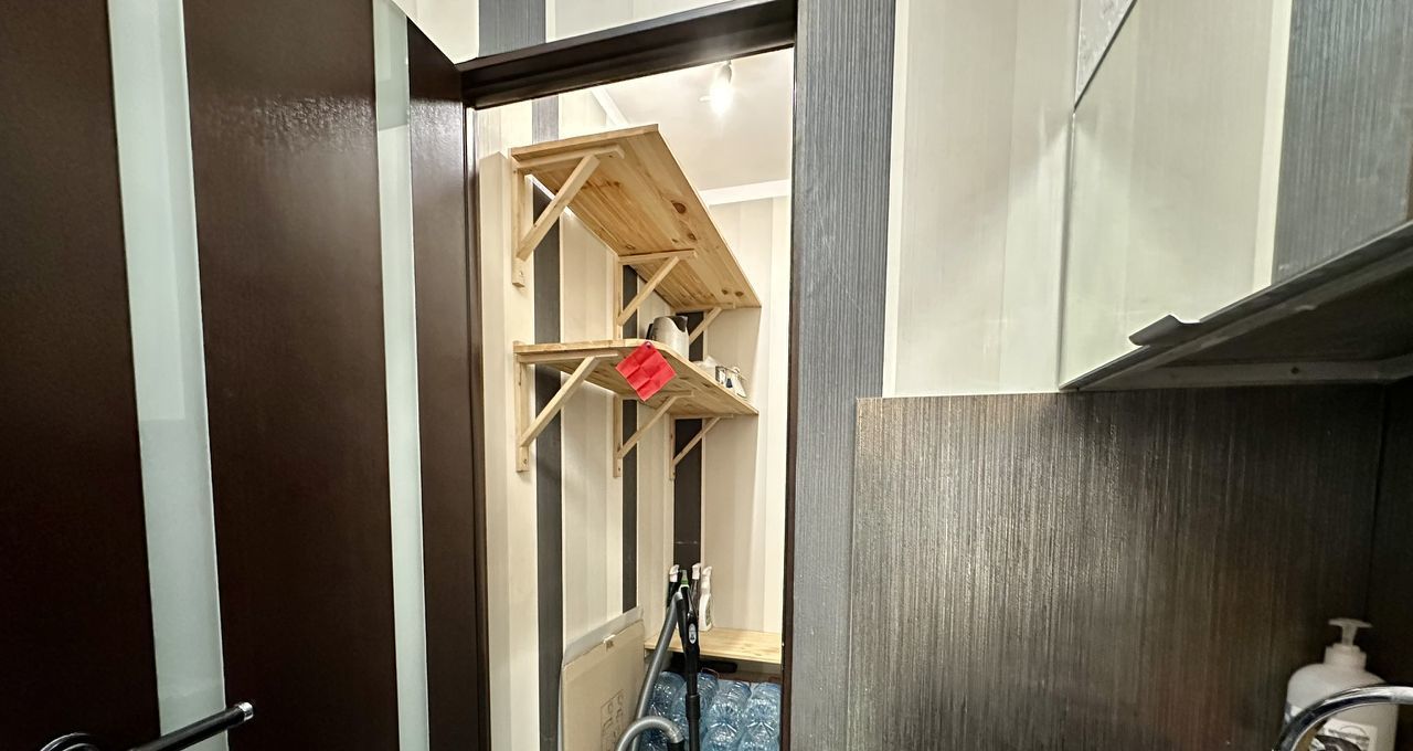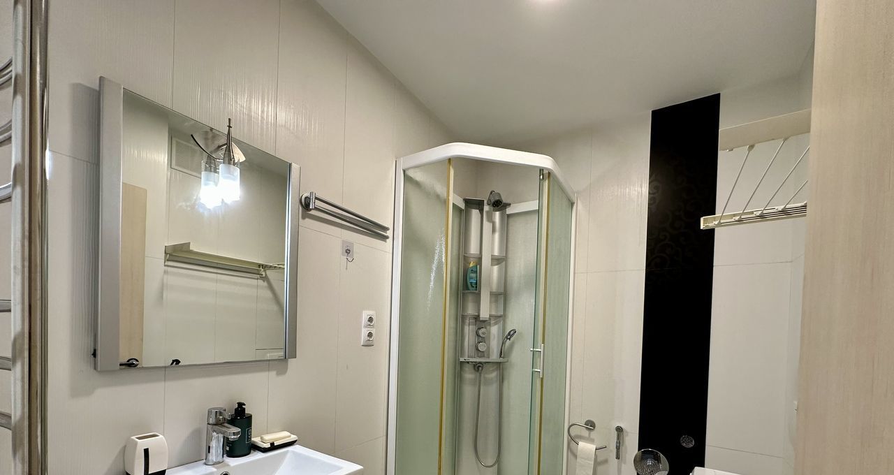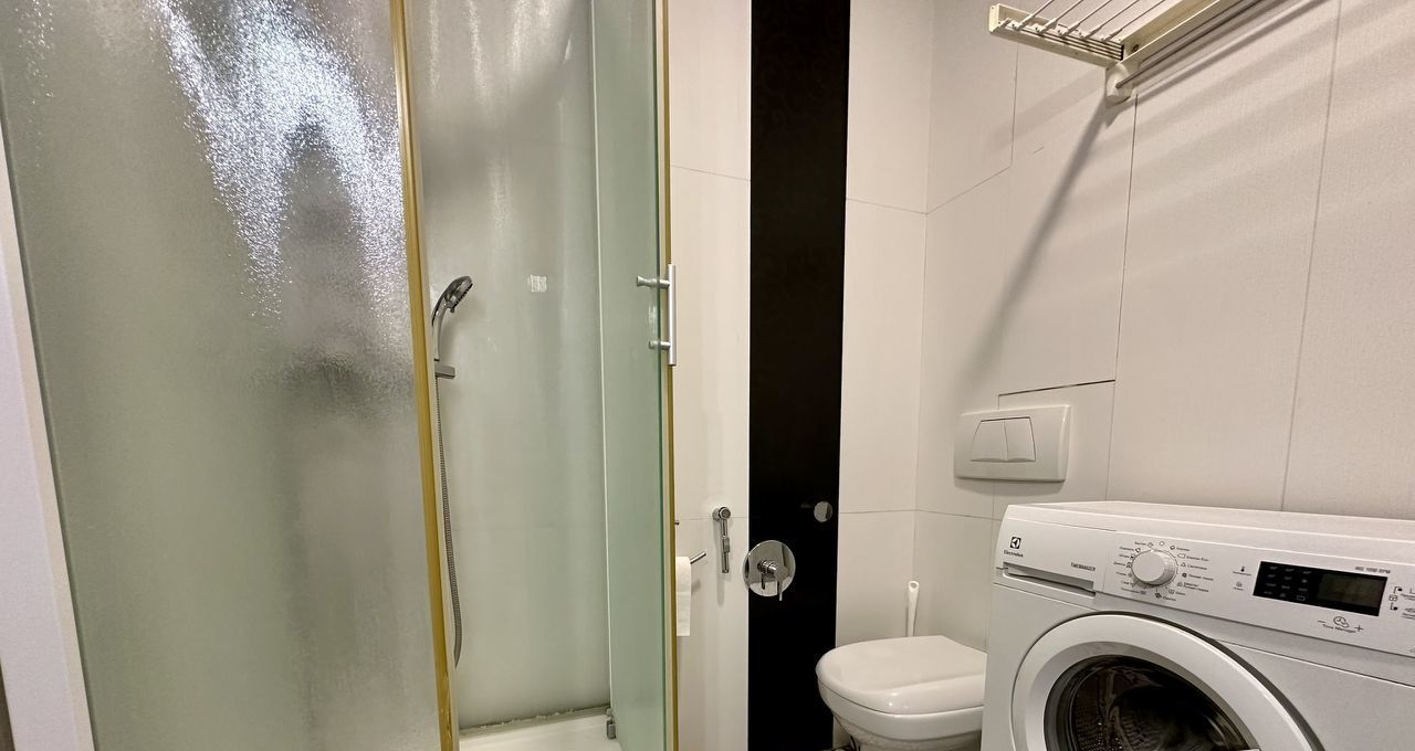 Совмещенный санузел с душевой кабиной и стиральной машиной. В прихожей большой шкаф-купе.