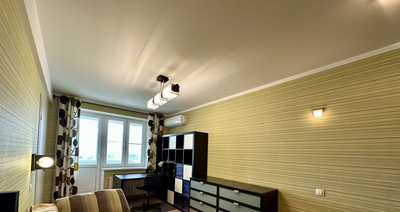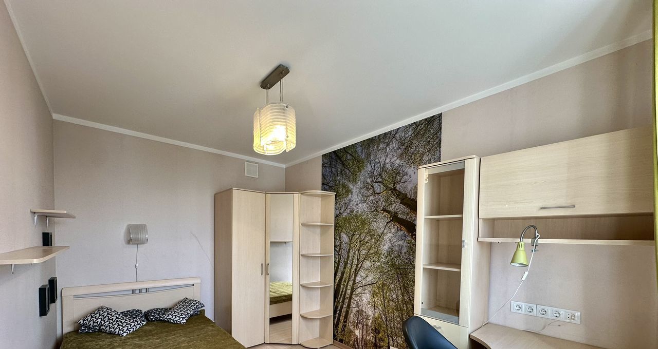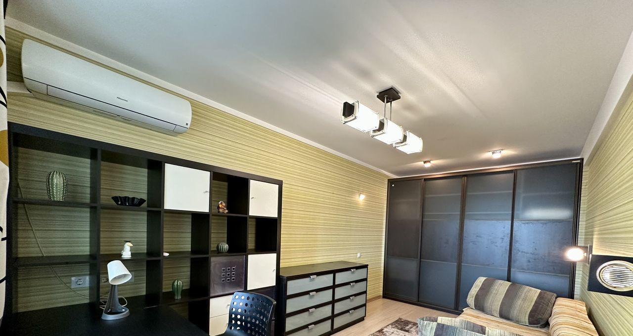 Большая - с раскладывающимся диваном, большим шкафом-купе во всю стену, стеллаж, комод и рабочее место возле окна. Из комнаты выход на просторную лоджию, которая оборудована под место для отдыха, откуда открывается прекрасный панорамный вид на город. Также в комнате установлен кондиционер.