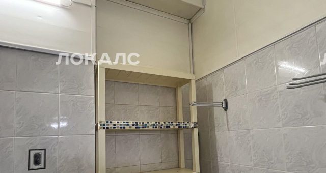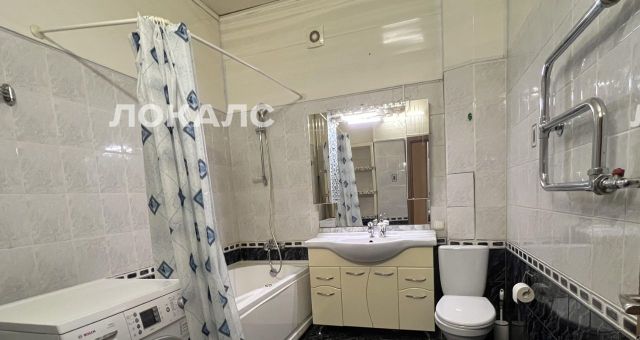 Санузел совмещенный, установлена стиральная машинка-автомат, есть сушка для белья и стеллаж для хранения.