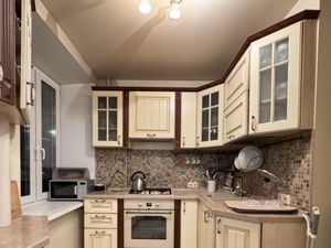 В спальне гарнитур с 2-спальной кроватью и хорошим ортопедическим матрасом, большим шкафом и комодом. Во 2й комнате также 2-спальная кровать с ортопедическим матрасом, функциональным шкафом-купе, рабочим столом. В гостиной раскладной диван с журнальным столиком, отсюда же выход на балкон. Большая кухня с гарнитуром и встроенной техникой (плита, посудомоечная машинка), 2-камерный холодильник и обеденной группой.