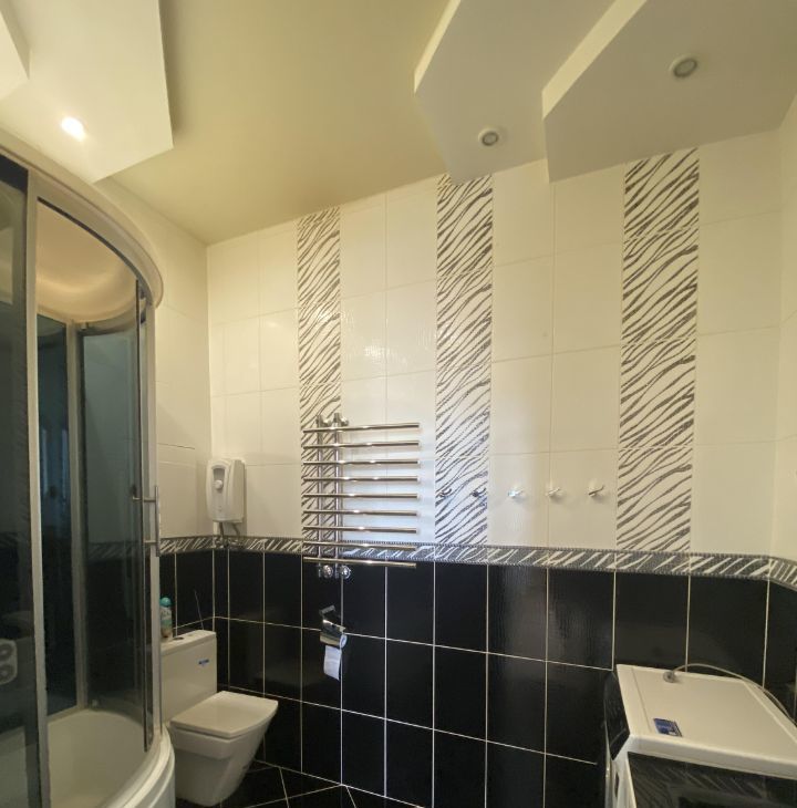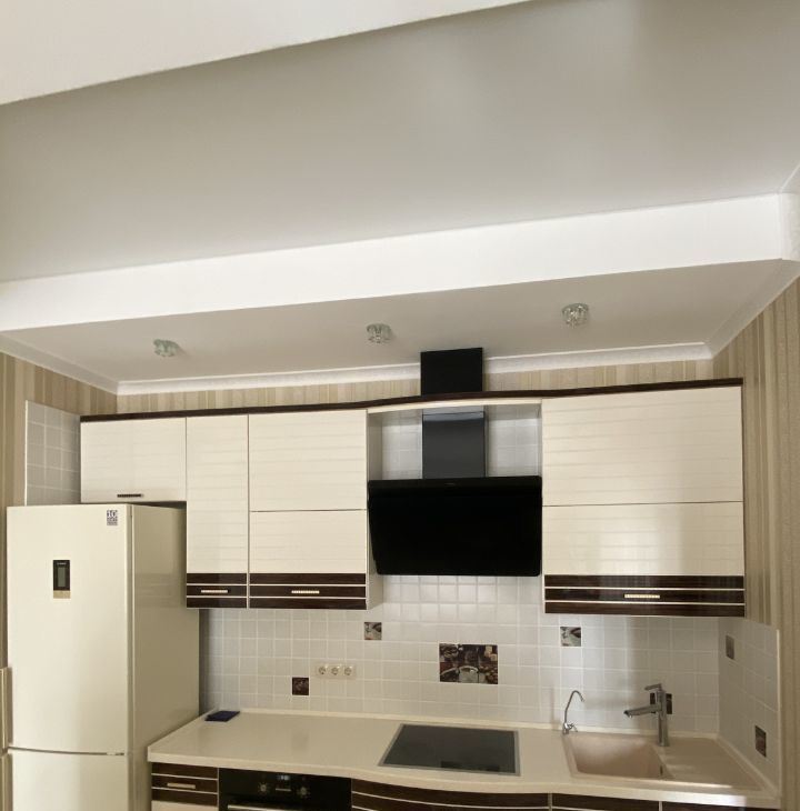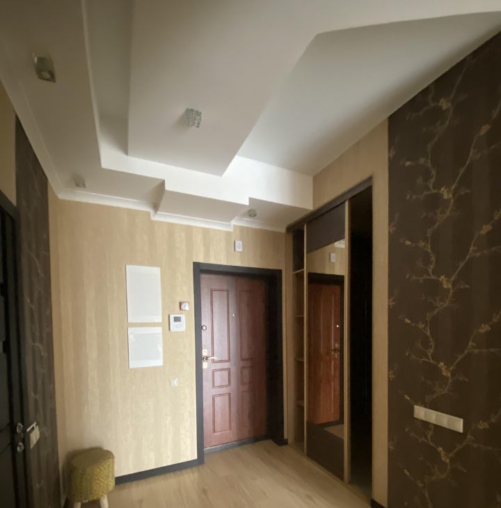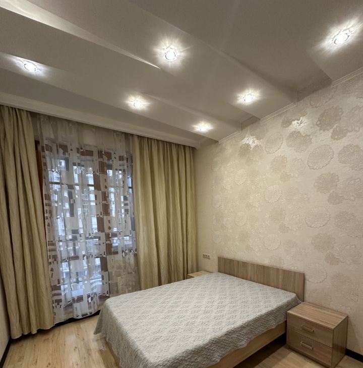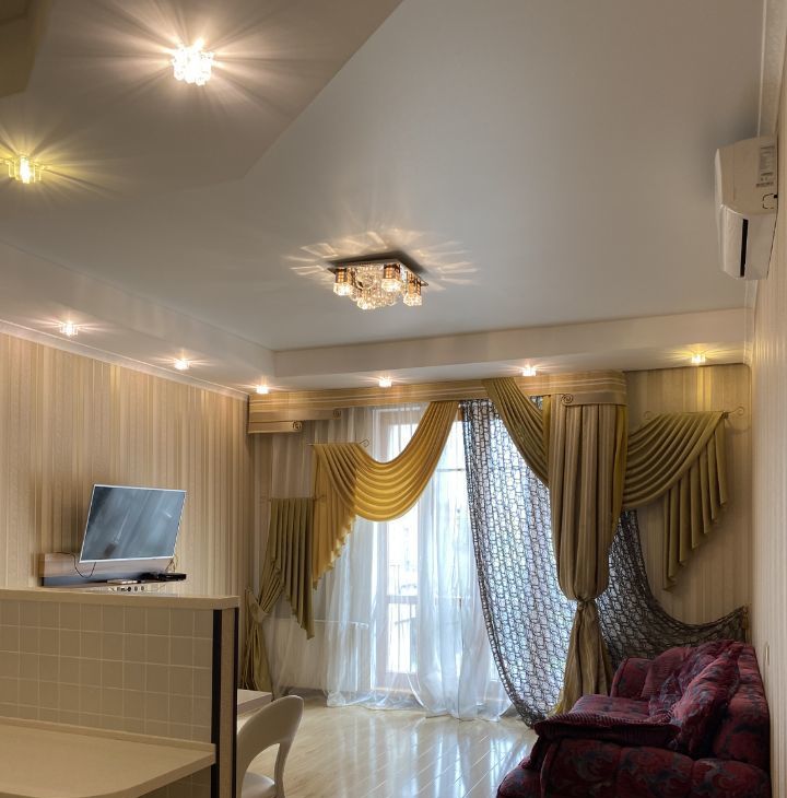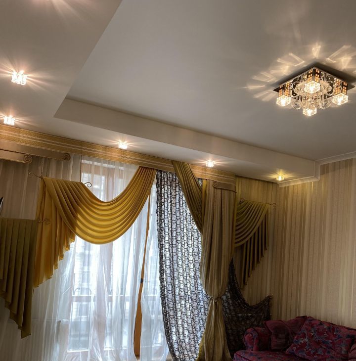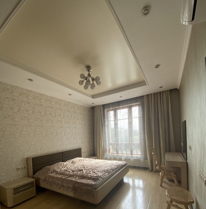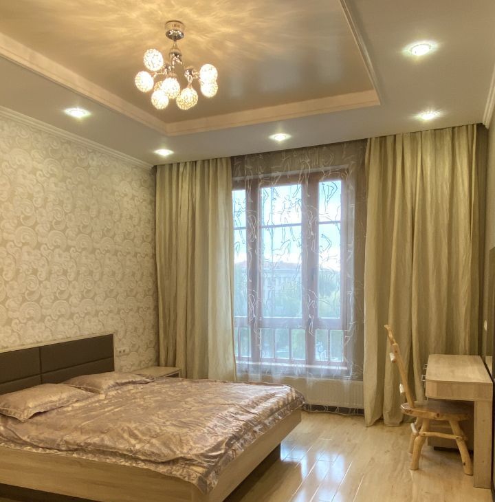 В квартире выполнен дизайнерский ремонт с использованием дорогих отделочных материалов. Многоуровневые потолки. Деревянные стеклопакеты. Ламинат.