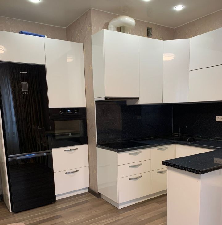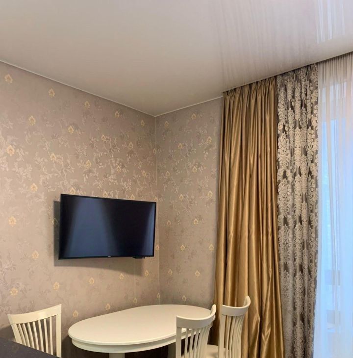 В гостиной установлен кондиционер, имеется телевизор и современный диван. Из мебели также предусмотрены вместительные шкафы. Кухня оборудована всей необходимой техникой, включая холодильник, духовой шкаф и варочную панель.