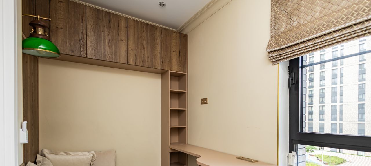 В квартире две спальни + отдельный кабинет с окном и раскладывающимся спальным местом.