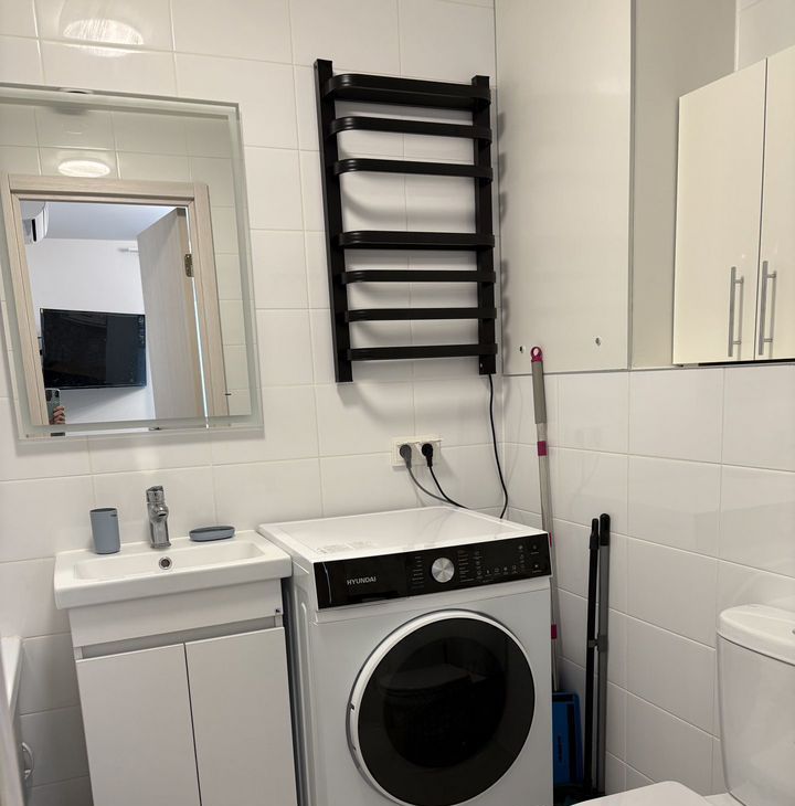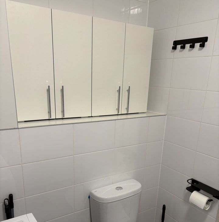 - два санузла, один небольшой - только унитаз и раковина, второй большой, в нем унитаз, ванна, стиральная машина с сушилкой, шкафчики.