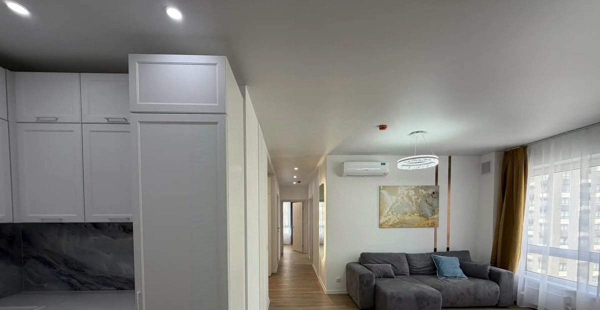 Сдаётся стильная квартира с дизайнерским ремонтом в районе метро Кантемировская. Общая площадь составляет 73,3 кв. м, из которых 32.8 кв. м — жилая площадь, а просторная кухня занимает 25,2 кв. м. В квартире три светлые изолированные комнаты. Квартира расположена на 18 этаже современного дома, 3 лифта — пассажирский и грузовым. Из окон открывается вид во двор.
