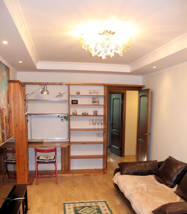 Комната гостиная: кожаный диван, телевизор с тумбой, раскладной стол, кабинет деревянный стол со стеллажом