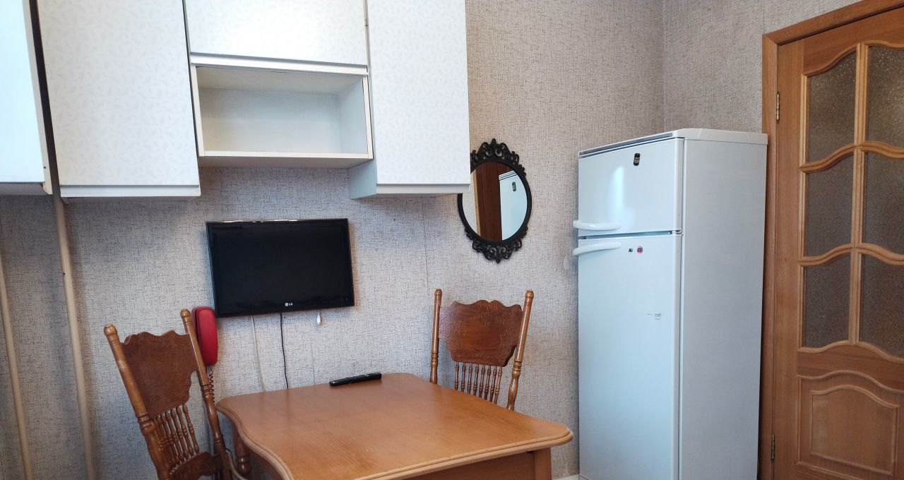 Просторная кухня площадью 10.2 кв. м. Электро плита, духовой шкаф, вытяжка, холодильник, а также два телевизора на кухне и в гостиной.
