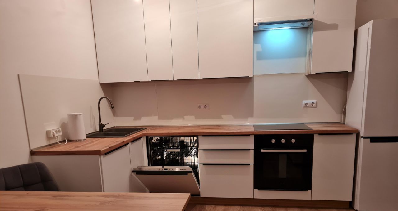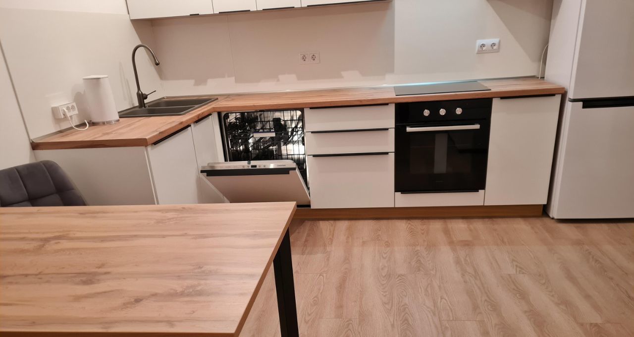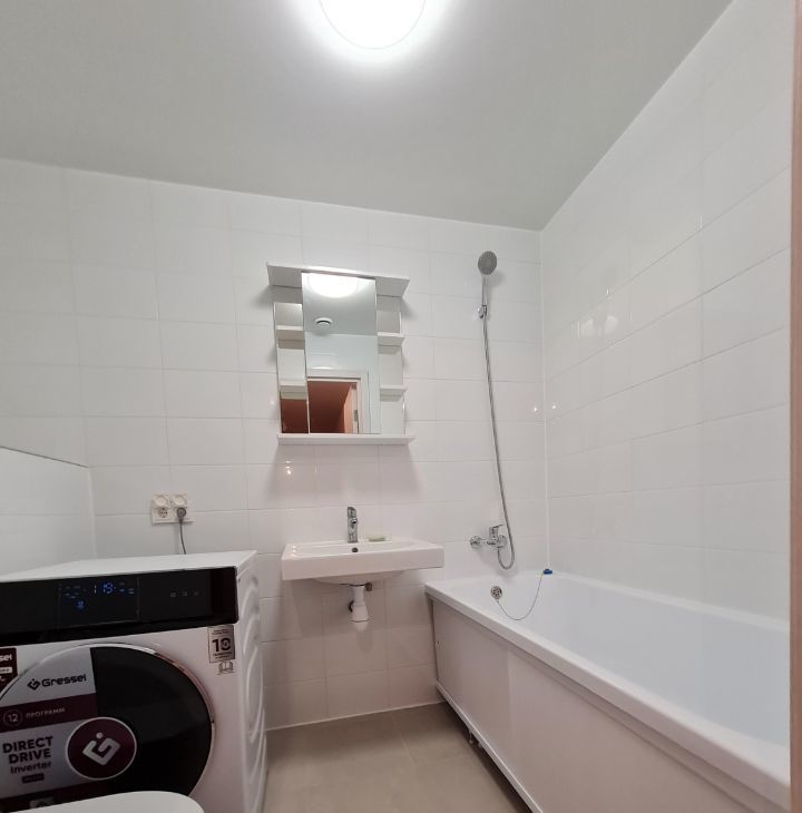 В квартире сделан качественный евроремонт. Все комнаты обставлены необходимой мебелью, на кухне есть современная техника: холодильник, посудомоечная машина, телевизор и стирально-сушильная машина. Планировка квартиры включает два совмещенных санузла, один из которых оборудован ванной, а другой — душевой кабиной. Окна выходят во двор, поэтому в квартире тихо и уютно.