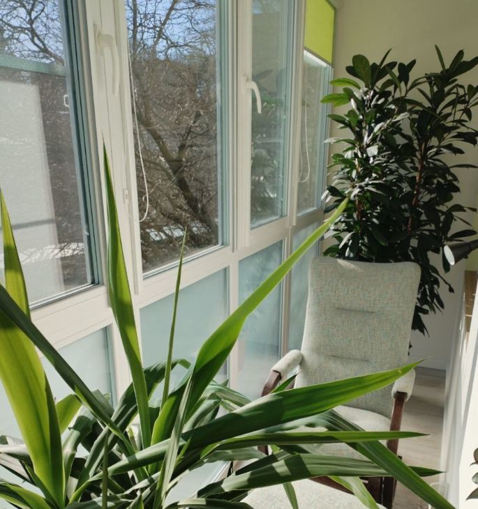 Планировка: изолированная спальня, гостиная (проходная), уютный кабинет. Просторная кухня с красивой мебелью. Санузел с душевой кабиной и гостевой санузел. Две лоджии с панорамным остеклением, одна оборудована под зимний сад.