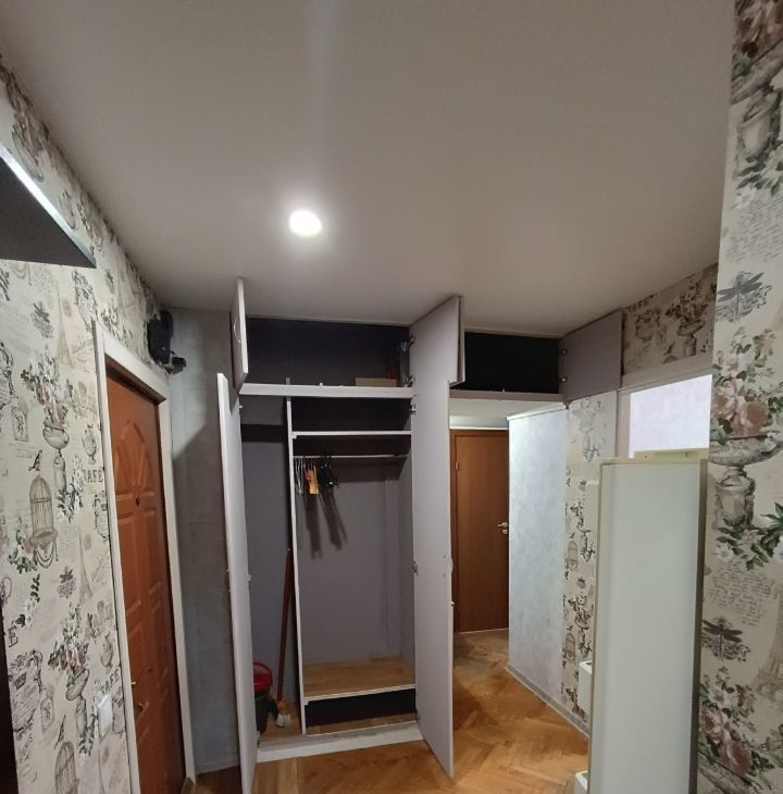 Мебель и техника: Кухонный гарнитур, прихожая, газовая плита, холодильник, стиральная машина, микроволновая печь, электрический чайник, утюг, посуда (частично), 2 телевизора, 2 шкафа + встроенный шкаф с антресолью в коридоре, 3 дивана, 2 кресла, столы, табуреты, на лоджии большой стеллаж для хранения.