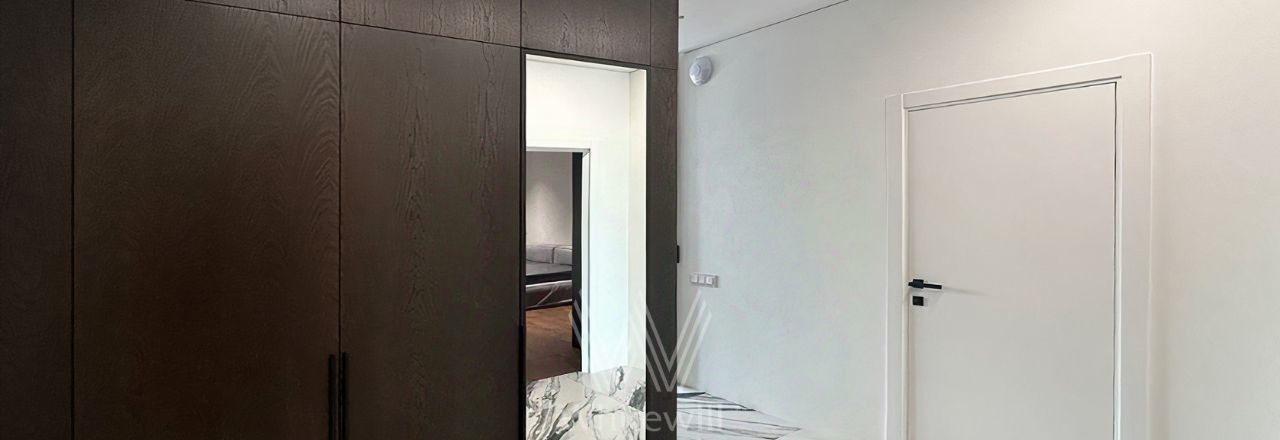 Спланирована кухня-гостиная с обеденной зоной, 2 спальни, санузел с душевой, гардеробная, прихожая, застекленная лоджия с оборудованной рабочей зоной. Квартира полностью меблирована и укомплектована премиальной бытовой техникой, установлена канальная система кондиционирования и вентиляции. В стоимость аренды входят 2 машиноместа в подземном паркинге около лифта.