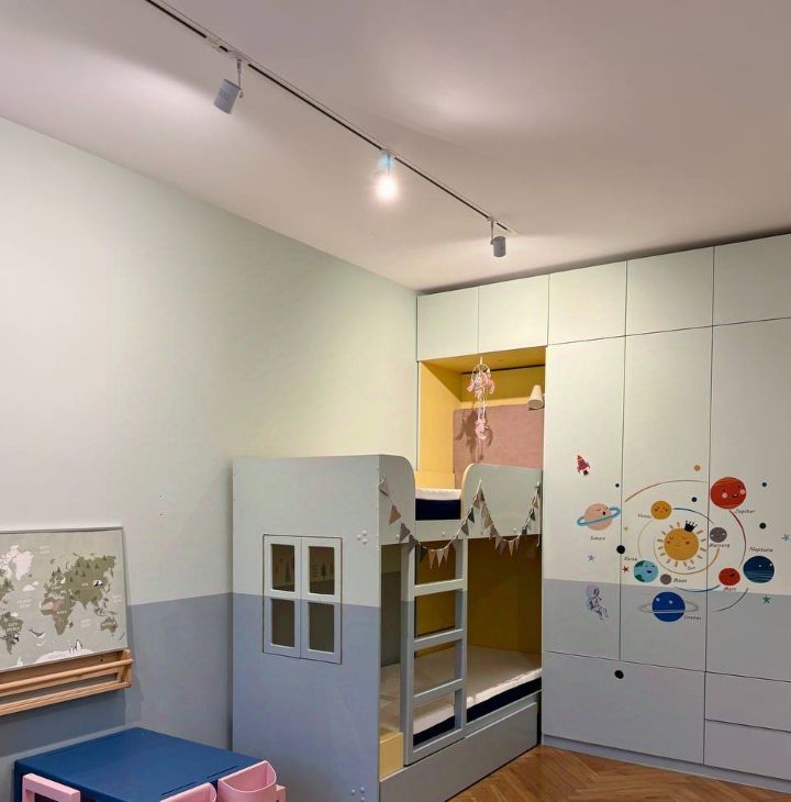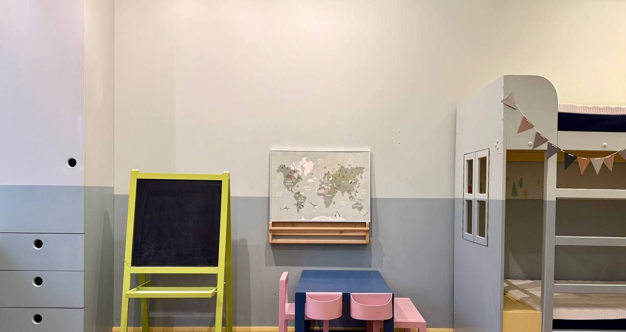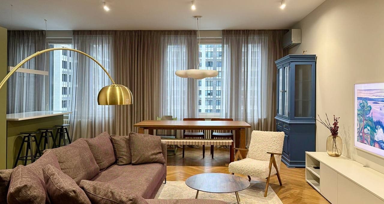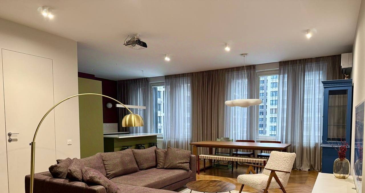 Просторная студия с зоной гостиной, столовой и кухней, отдельная спальня и большая детская комната. Площадь 108,6 кв. м. Два санузла.