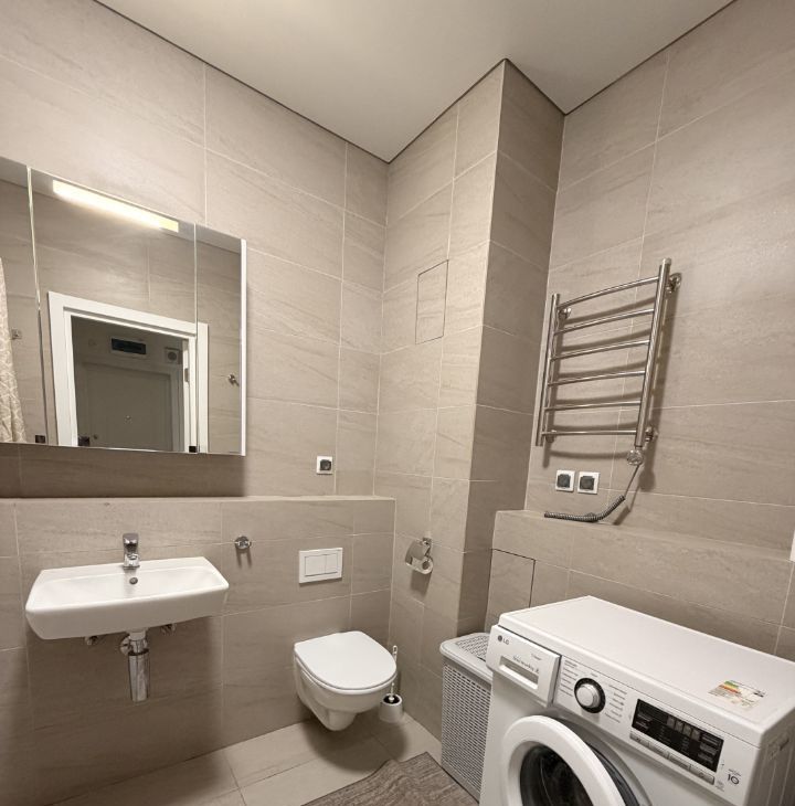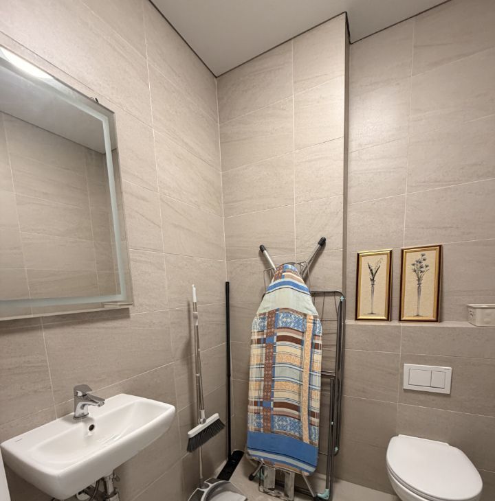 В планировке — два санузла: просторный с ванной и компактный гостевой с раковиной и унитазом.