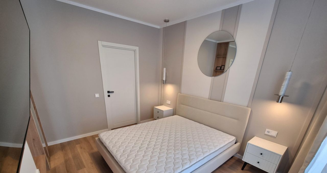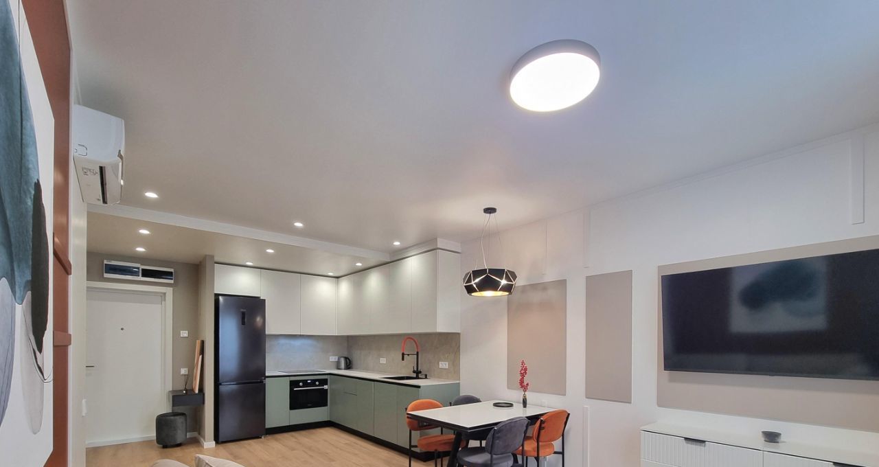 Кварцвинил и керамогранит. Шторы blackout. Сплит система. Практически вся мебель произведена и смонтирована под заказ. В каждой комнате несколько источников света с разным типом освещения и настраиваемой теплотой. Квартира ни разу не сдавалась, никто не жил. Укомплектована всей новой мебелью и бытовой техникой.