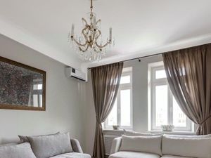Функциональная планировка квартиры: кухня-гостиная, спальная комната со своим совмещенным с/у с душевой кабиной, 2-я спальня, совмещенный с/у с ванной, прихожая. Есть незастекленный балкон. Окна кухни-гостиной и 1 спальни выходят во двор, а окна 2-ой спальни на Кутузовский проспект. Квартира меблирована и укомплектована всей необходимой техникой для комфортного проживания. Современный ремонт в светлых тонах.