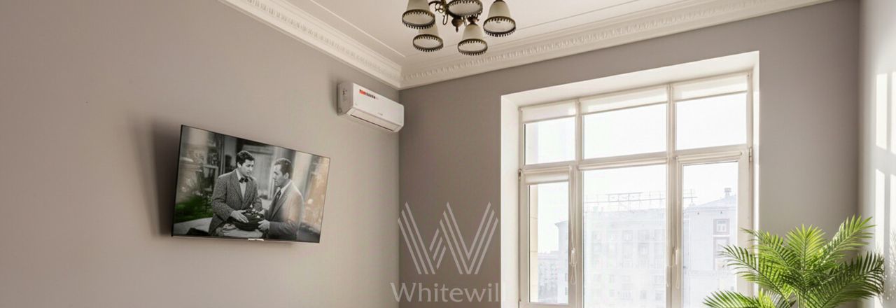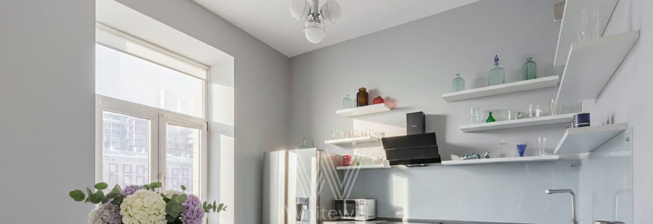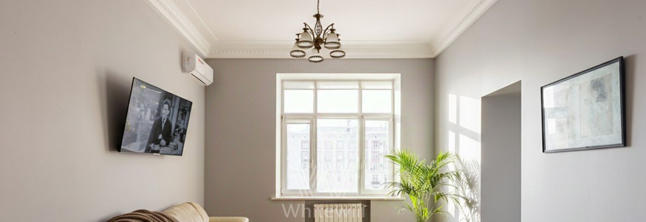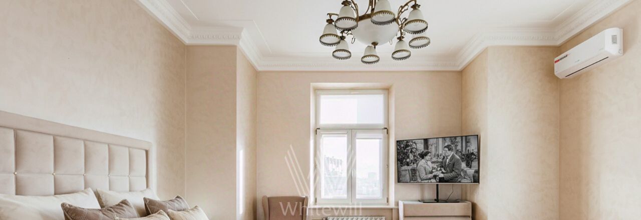 Квартира с 2 спальнями в знаменитой гостинице "Украина" на набережной Москвы-реки. Квартира общей площадью 100 м² расположена на 8 этаже. Выполнена отделка в стиле современной классики в светлых тонах. Большие окна наполняют пространство светом и открывают виды на Кутузовский проспект. Спланирована гостиная, изолированная кухня с обеденной зоной, спальня, комната свободного назначения, ванная комната с джакузи и душевой, прихожая. Квартира полностью меблирована и оборудована бытовой техникой, установлены кондиционеры.