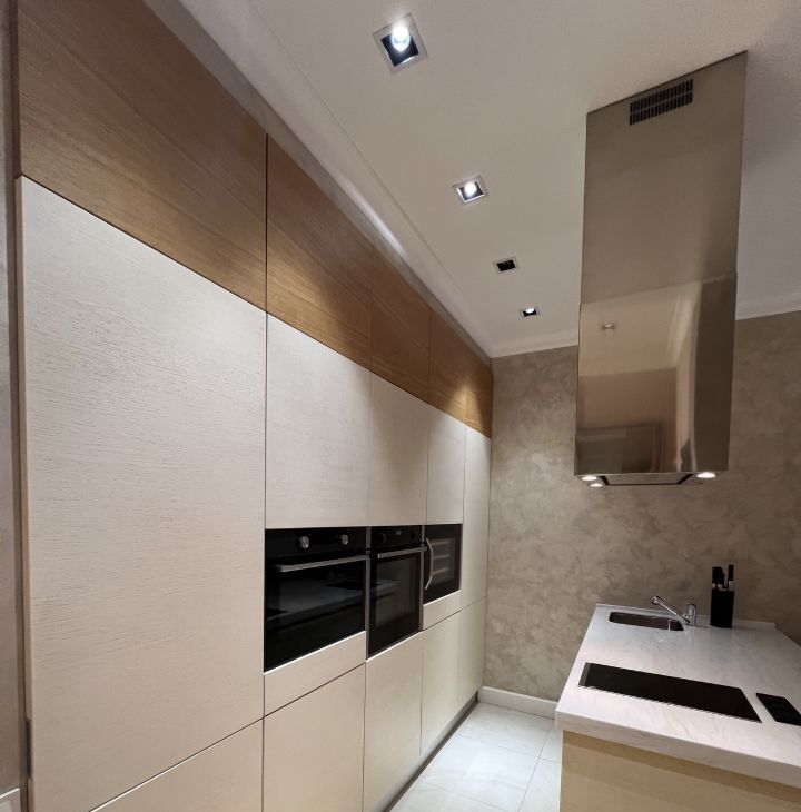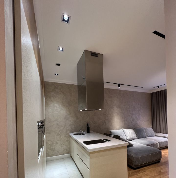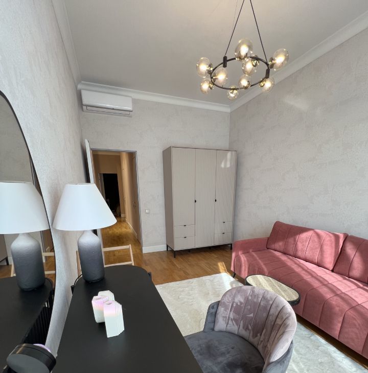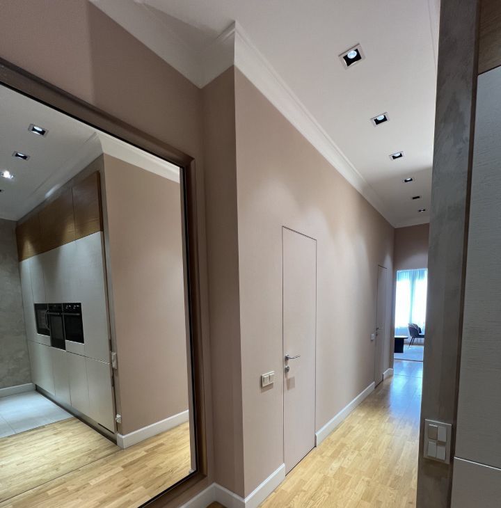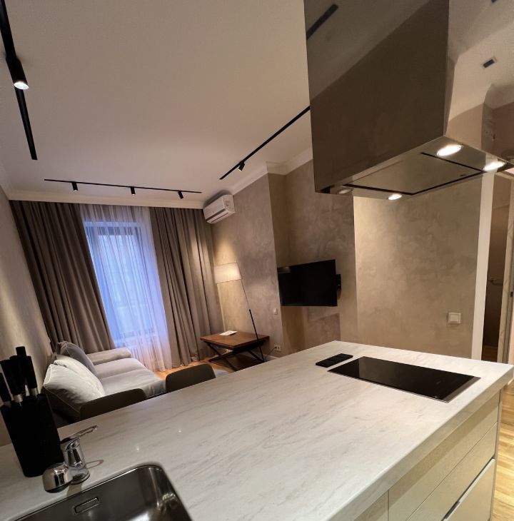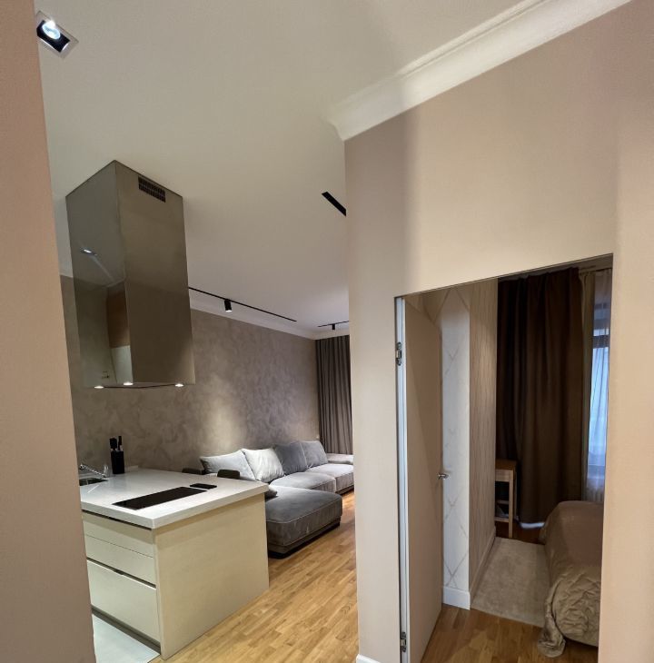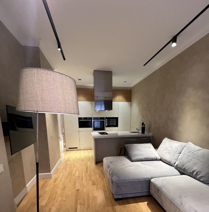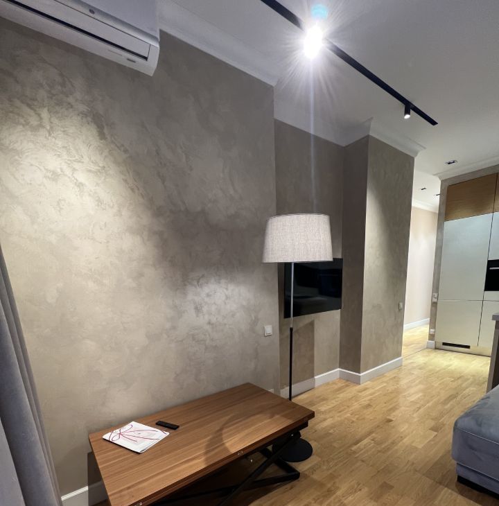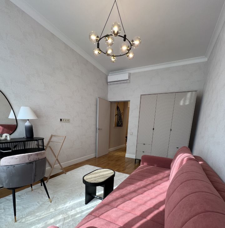 В квартире дизайнерский ремонт, с дорогой мебелью и отделочными материалами.