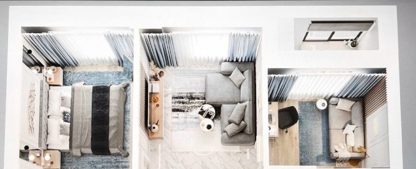 Идеально подойдёт для пары или семьи с ребёнком: кухня-гостиная, спальня, кабинет (при необходимости может использоваться как детская), совмещённый санузел, отдельная кладовая/прачечная, лоджия.