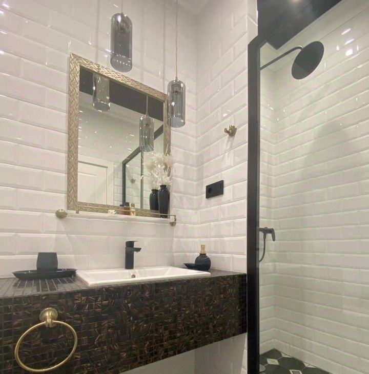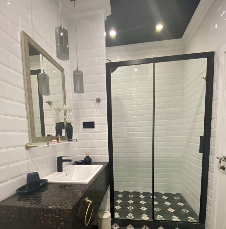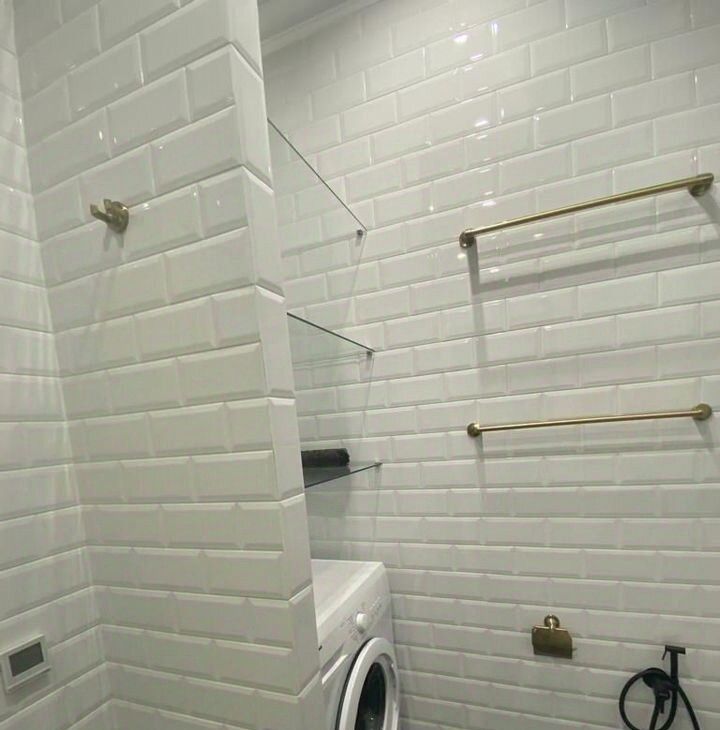 Два стильных санузла, один с большой душевой и постирочной зоной. Светильники, бра, торшер, аксессуары в санузлах в едином стиле европейского производства.