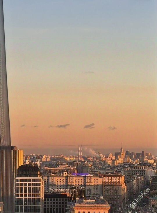 • Небоскрёб с фасадом из стекла и натурального камня;