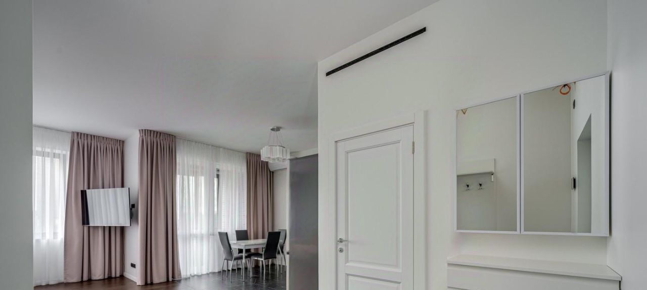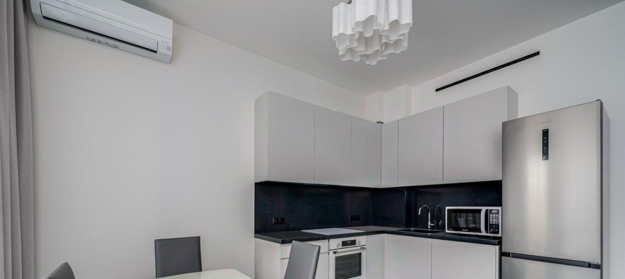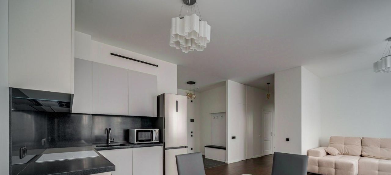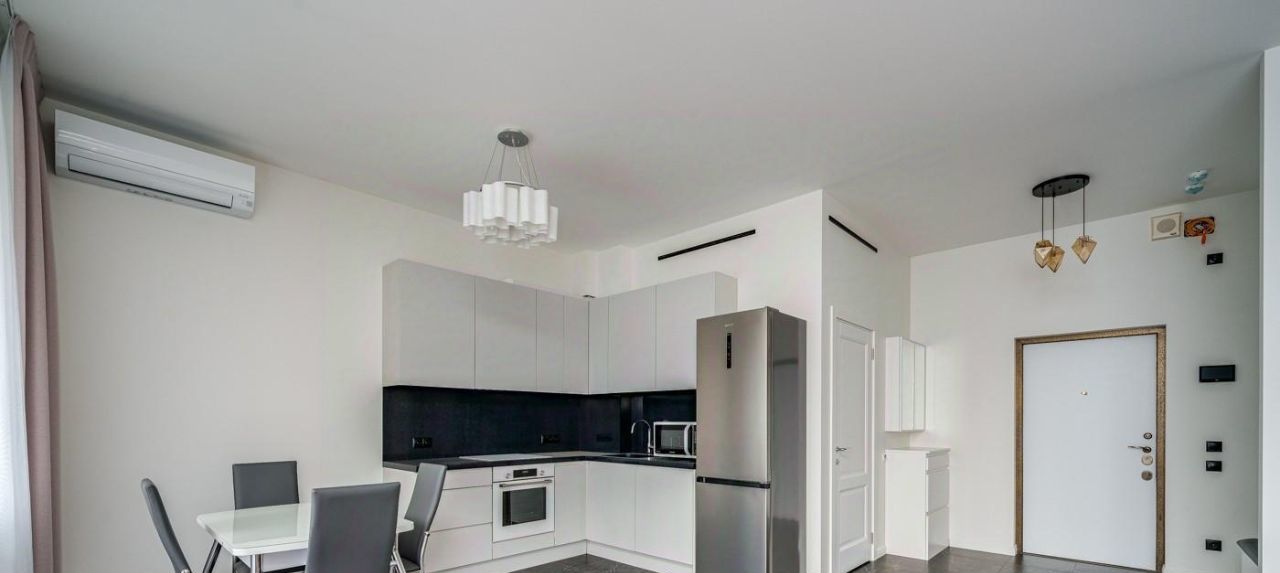 ДВЕ изолированные спальни и кухня-гостиная. Два санузла. Выполнен качественный ремонт. Квартира меблирована и оборудована современной бытовой техникой. Из меньшей комнаты вывезена мебель, мы можем поставить детскую кровать или арендатор может использовать свою мебель.