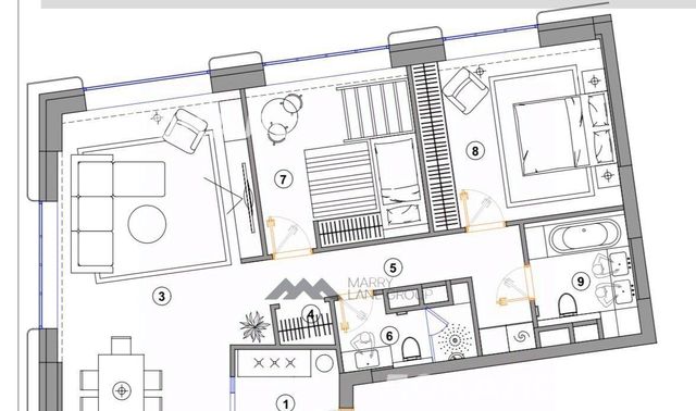 В апартаменте предусмотрена большая зона кухни-гостиной площадью около 40м2. В рабочей зоне кухни установлена вся необходима современная и качественная бытовая техника: холодильник Whirpool, плита Bosh, духовка Bosh, вытяжка, кофе-машина Bosh, микроволновая печь Bosh, винный шкаф Liebherr, разведен теплый пол. В зоне гостиной - большой диван, который раскладывается в полноценное спальное место, телевизор LG, система хранения.