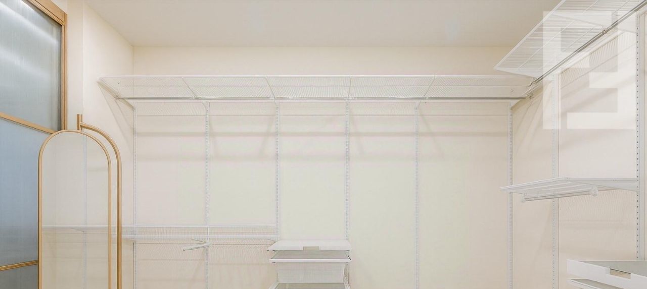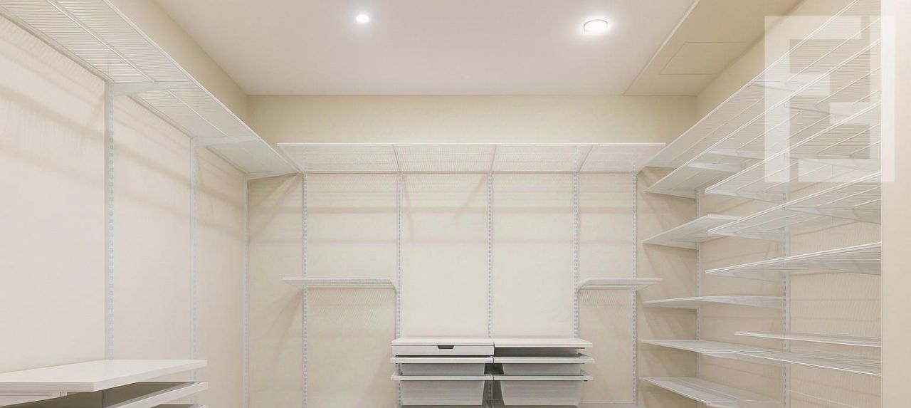 | Просторная гардеробная с системой хранения, которая выдержит гардероб двух активных людей.