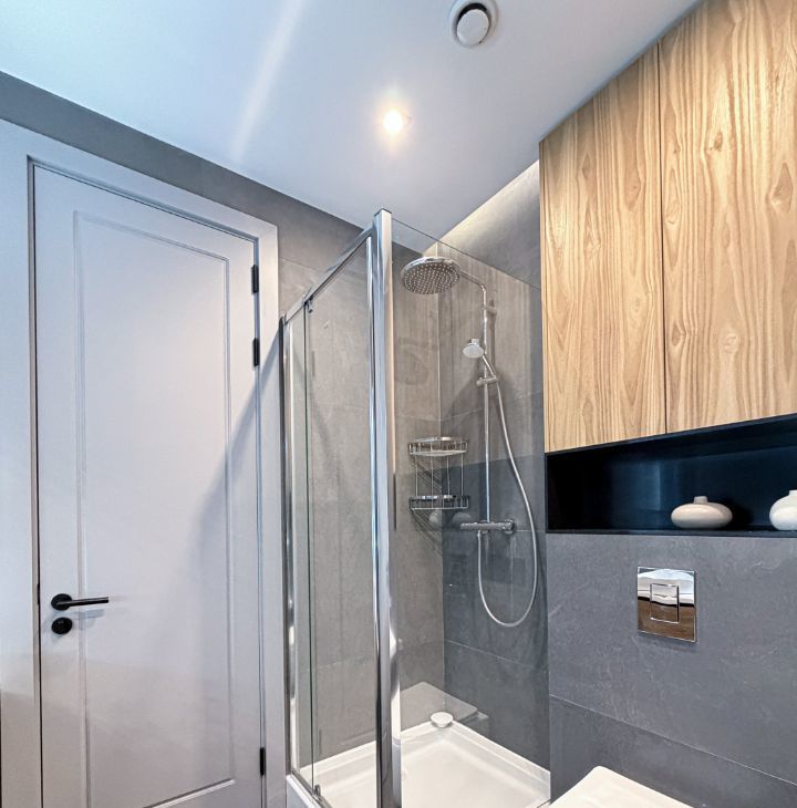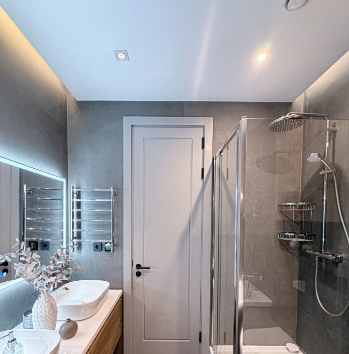 - ванная комната с душевой кабиной, ванной и санузлом ;