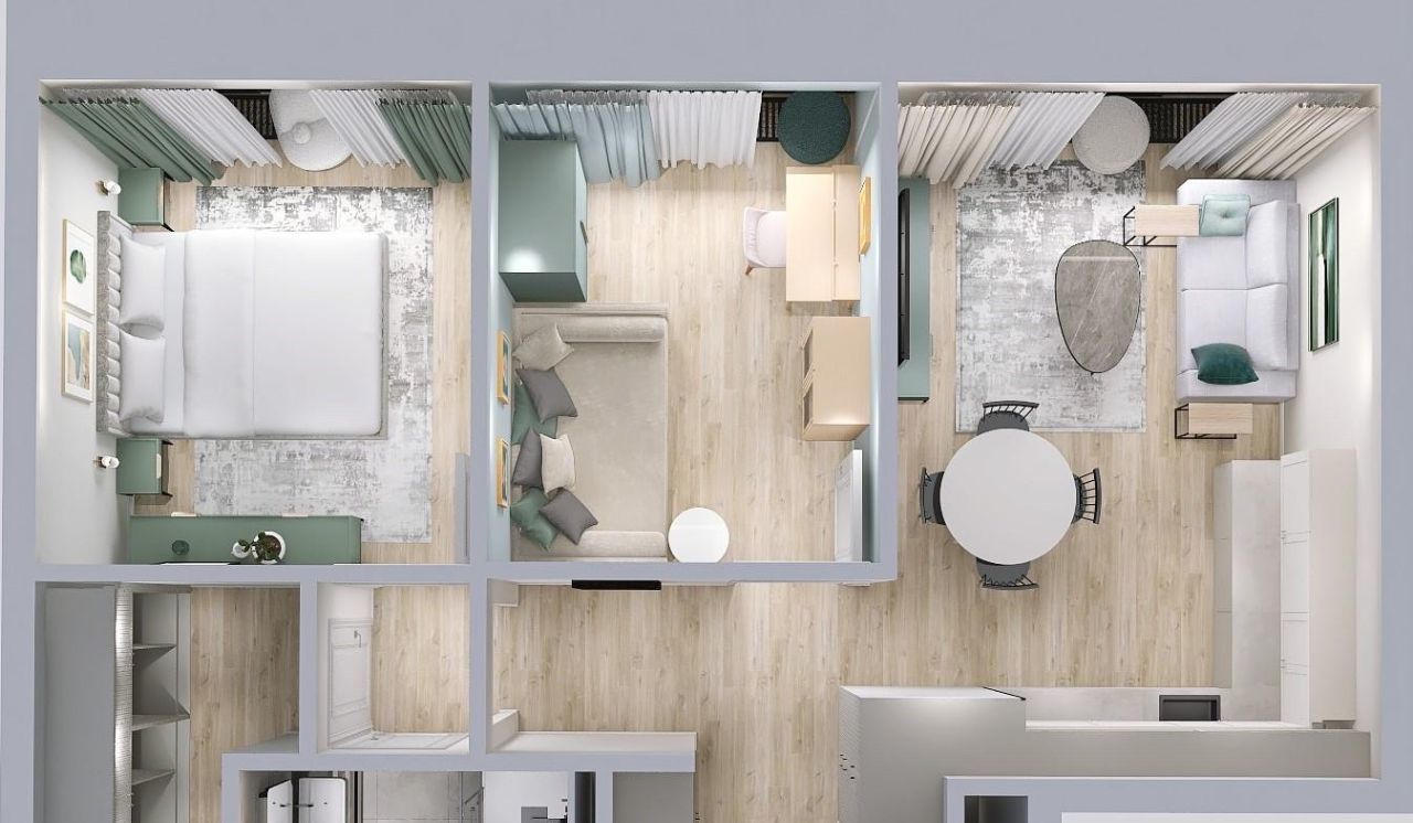 - гостиную с кухонной и обеденной зонами;
