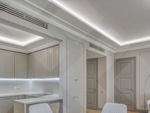 Квартира очень светлая и просторная. Функциональная планировка предусматривает: большую кухню-гостиную с визуальным разделением зоны приготовления и зоны отдыха, гостевой санузел, уютную спальню со своей ванной комнатой и комнату-спальню для гостей. Квартира с дизайнерской отделкой по индивидуальному дизайн-проекту. Ремонт выполнен из импортных высококачественных и экологичных материалов. Кондиционирование, теплые полы, шумоизоляция, всегда будет тихо и спокойно! Потолки 3.1 метра.