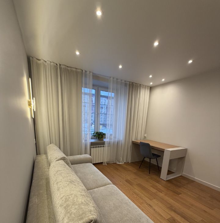 Три окна выходят в благоустроенный, зеленый внутренний двор.Одно окно выходит на Ленинградский проспект, обеспечивая вид на архитектурный ансамбль района. Благодаря качественному остеклению и толщине стен шум магистрали в квартире полностью отсутствует.