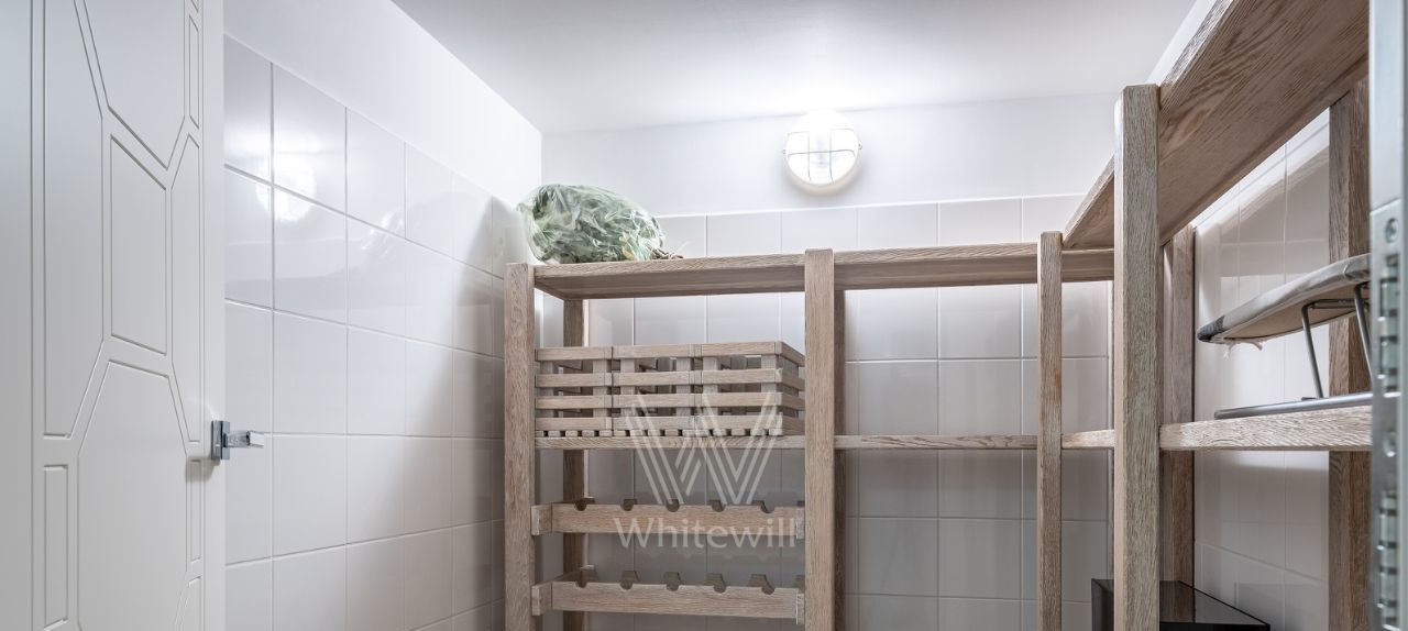 Цокольный этаж: кладовое помещение, постирочная комната с местами хранения, гардеробная, санузел с душевой и сауна.
