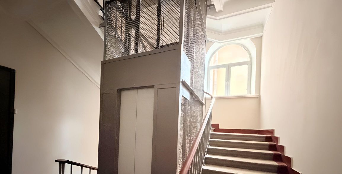 Несущие стены дома толщиной более 1 метра обеспечивают отличную звуко и теплоизоляцию, высота потолков - 3,3 м, въезд в тихий и зеленый двор дома огорожен шлагбаумом.