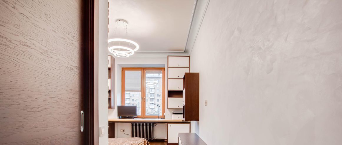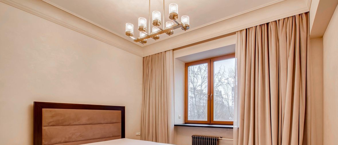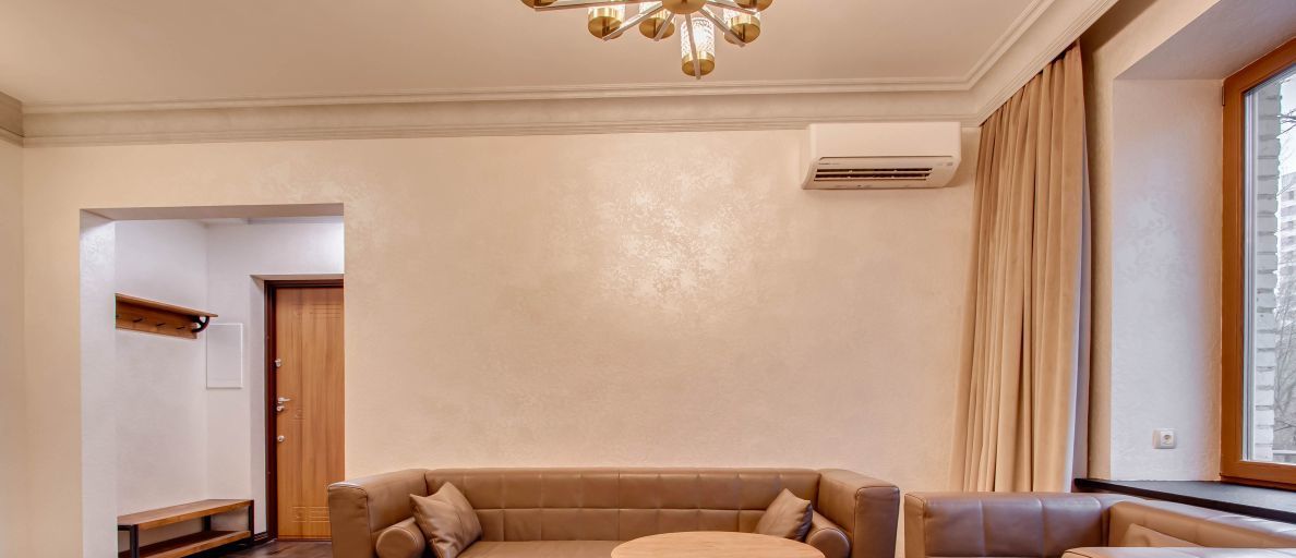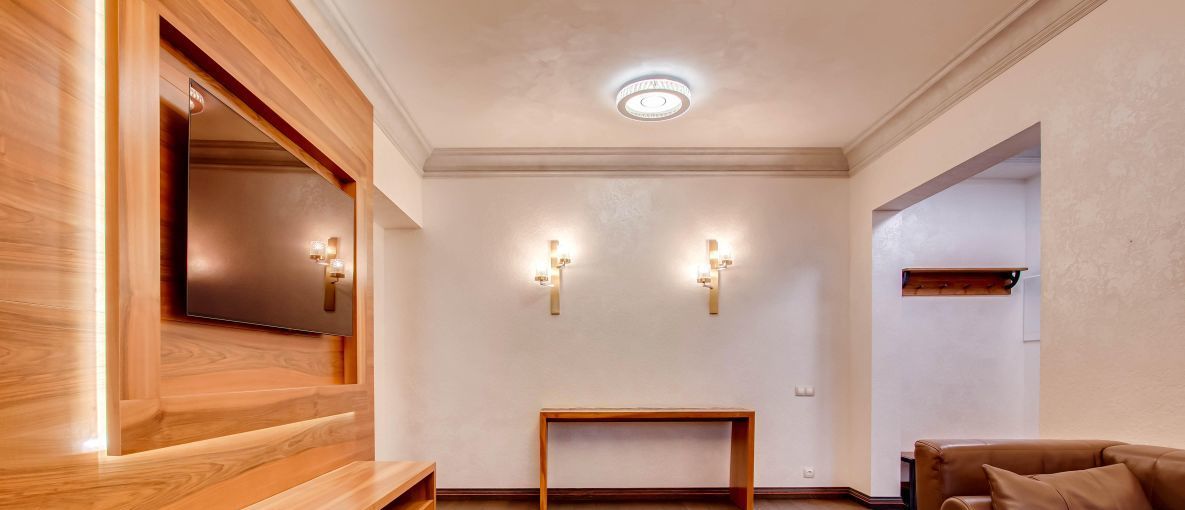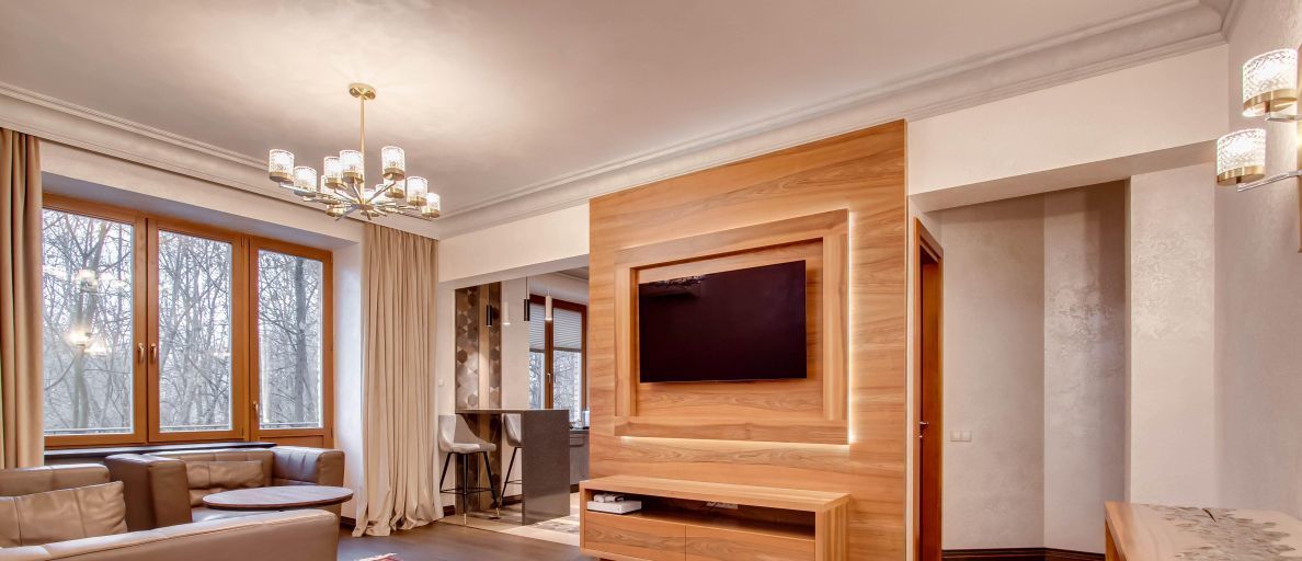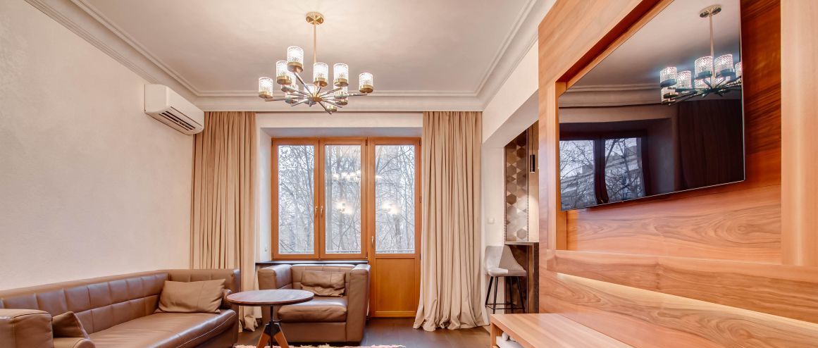 Просторная комнаты с высокими потолками и лепным карнизом. ТВ-зона выполнена в виде панели из массива светлого дерева на заказ с подсветкой — визуальная доминанта интерьера. Кожаные диван и кресло, дизайнерская люстра в стиле mid-century. Французские окна с деревянными рамами. Кондиционер.