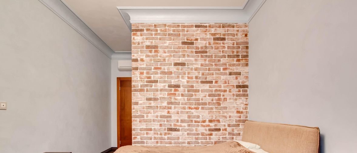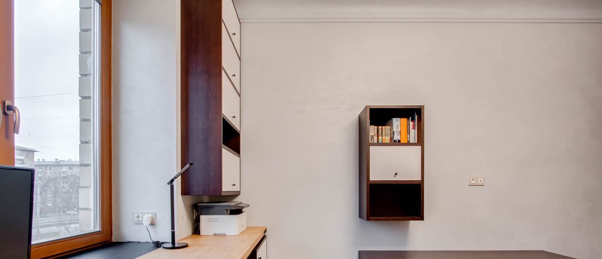 Встроенная мебель на заказ, рабочий стол вдоль всей стены с надстройкой из тёмного шпона и белых фасадов, системы хранения. Кирпичная стена за изголовьем кровати.