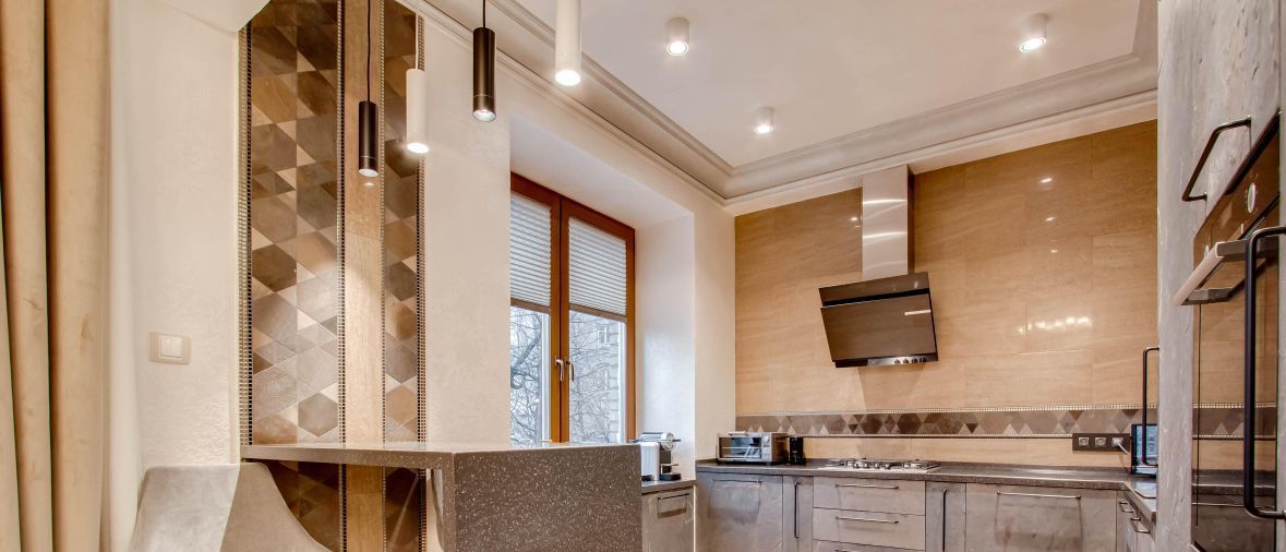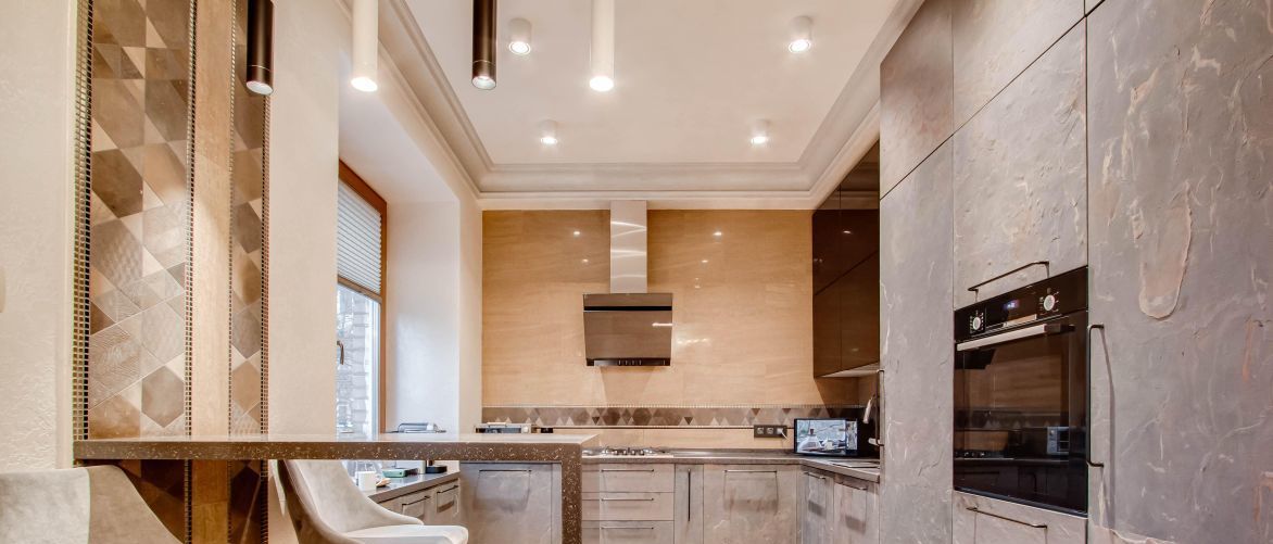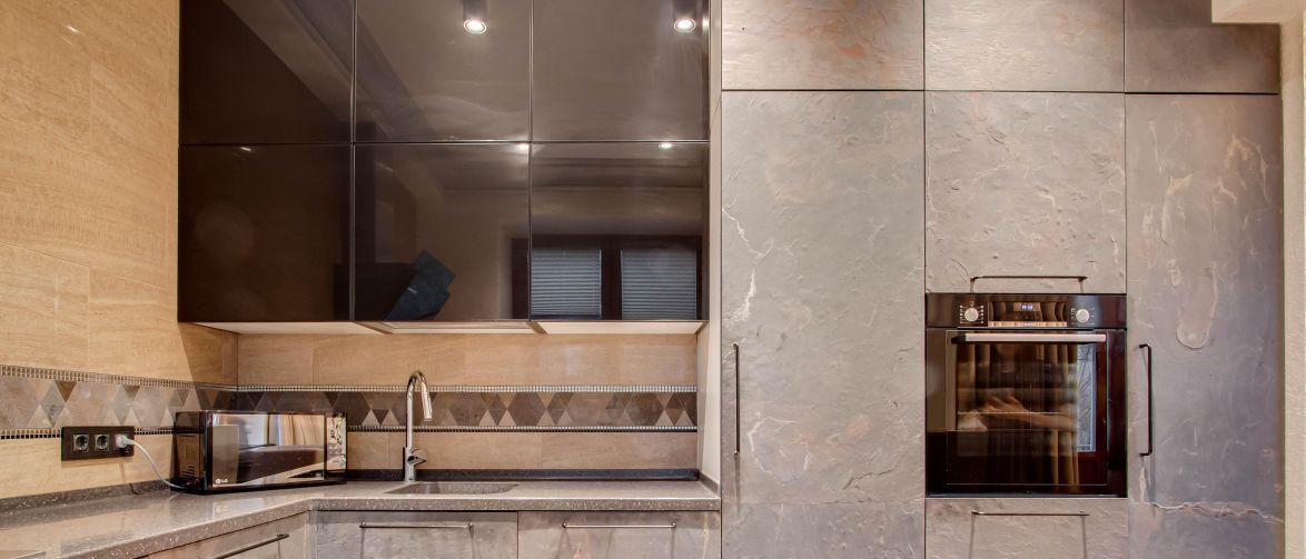Кухня с фасадами под натуральный камень (бетон-эффект) и столешницей из искусственного камня. Барная стойка с велюровыми барными стульями. Встроенная техника: духовой шкаф, газовая варочная поверхность, вытяжка, микроволновка. Авторская мозаичная плитка на фартуке и полу.