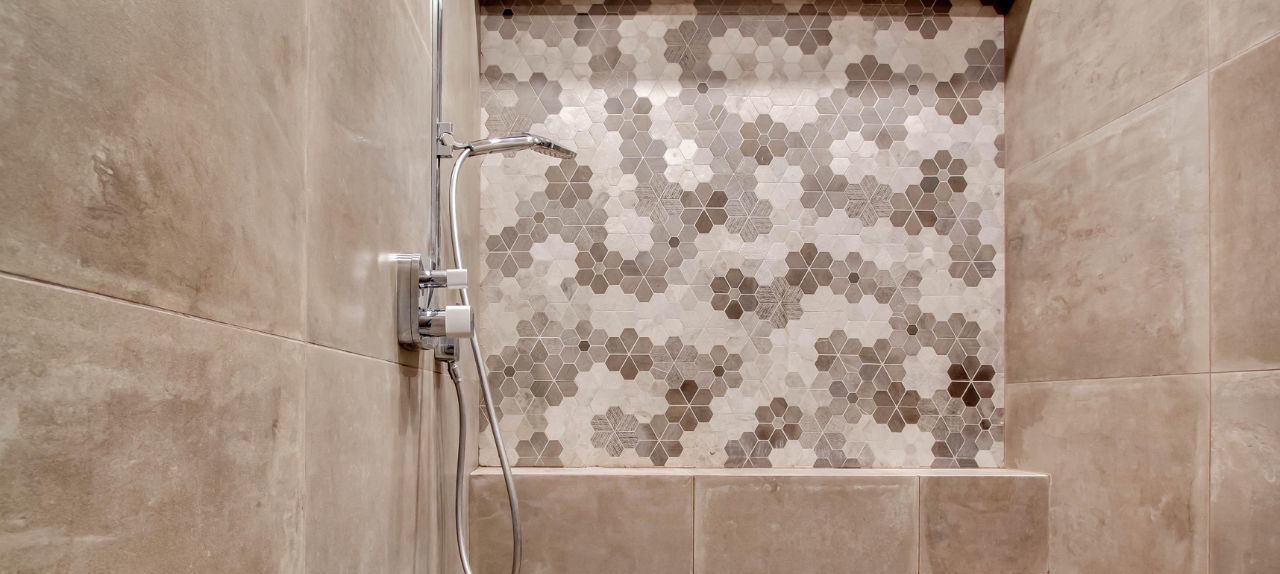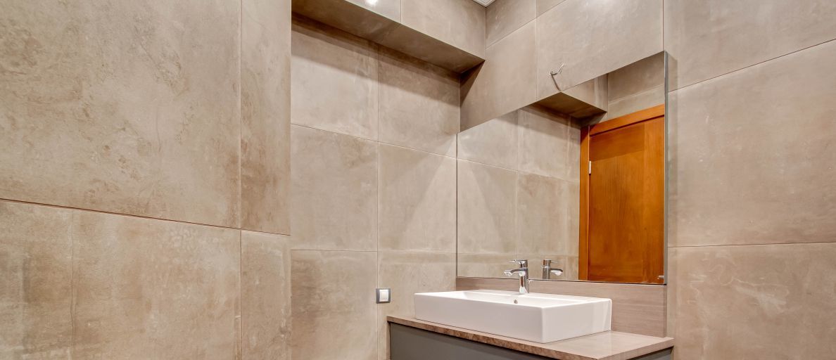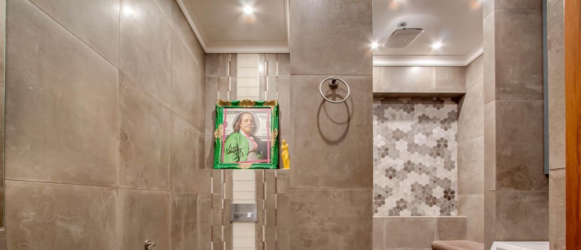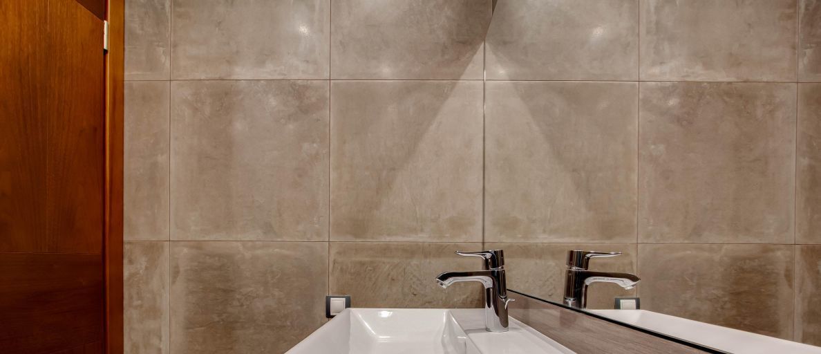 Санузел совмещённый и просторный. Полноразмерная душевая зона с тропическим душем, встроенной скамьёй и мозаичной плиткой на акцентной стене — выполнена как в СПА. Навесной унитаз. Широкая раковина-чаша на деревянной столешнице. Стиральная машина. Крупноформатная плитка под бетон.